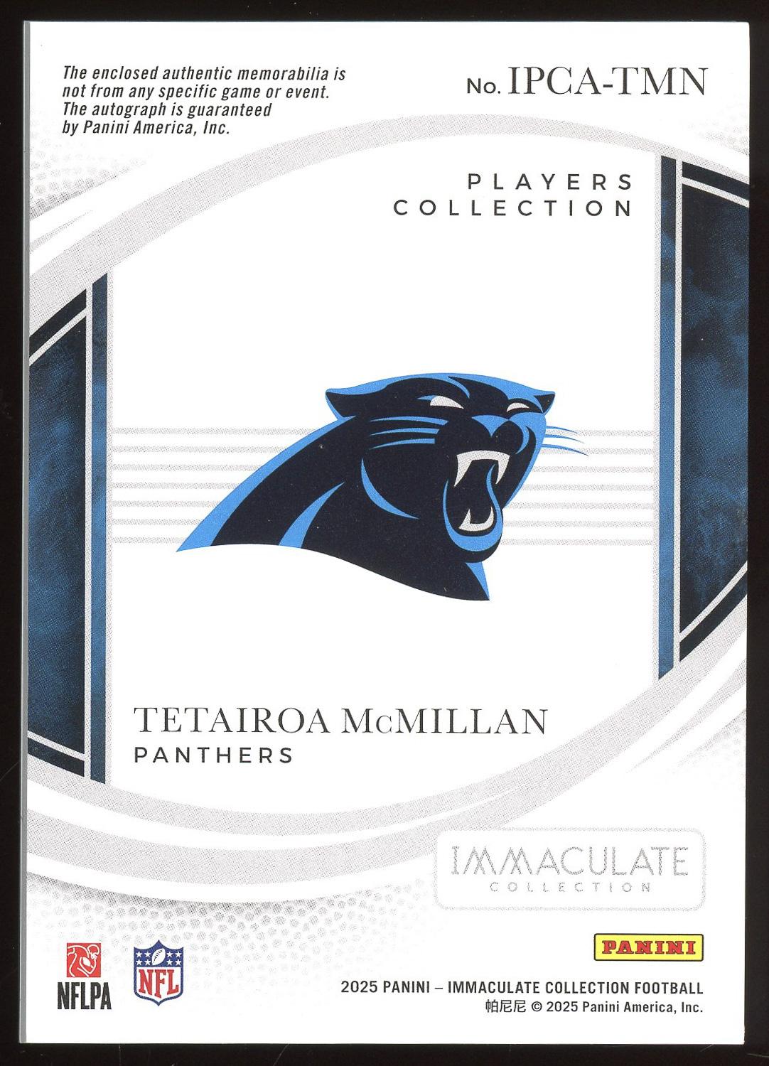 Tetairoa McMillan 2025 Panini Immaculate Players Collection Laundry Tag Rookie Patch Auto Card /99