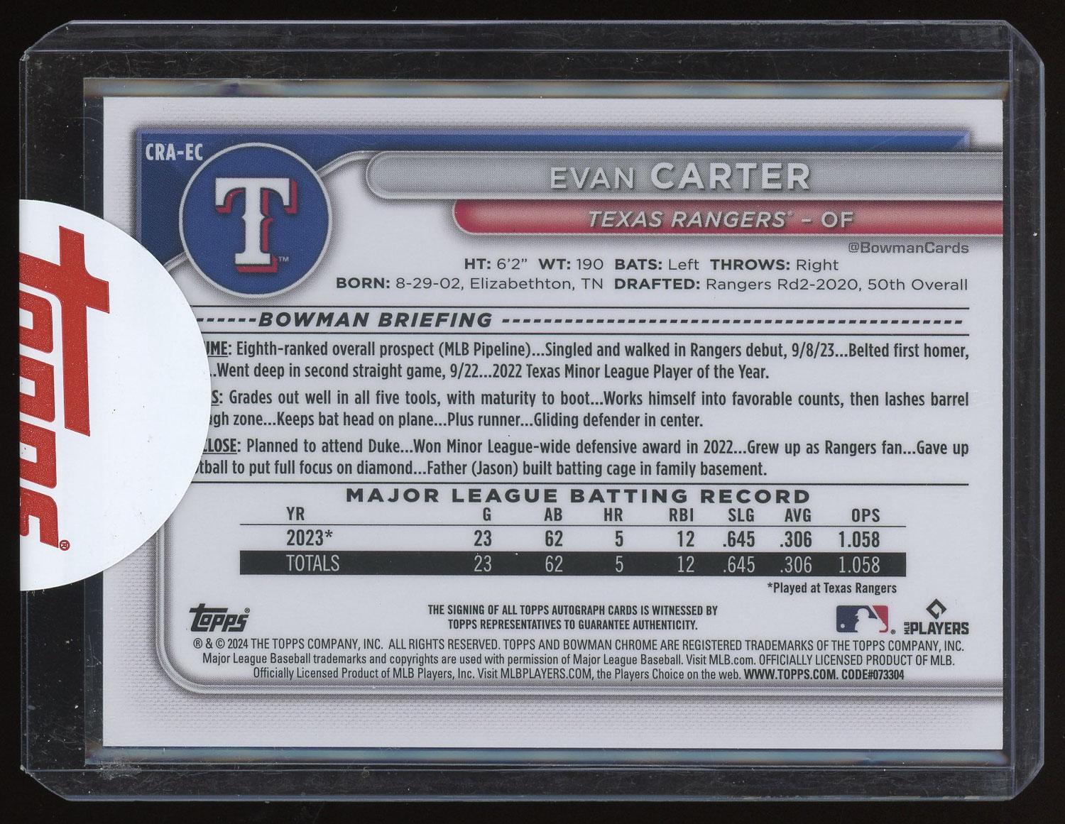Evan Carter 2024 Bowman Chrome Green Rookie Auto Card /99. Please see pictures for details on the condition of this card.
