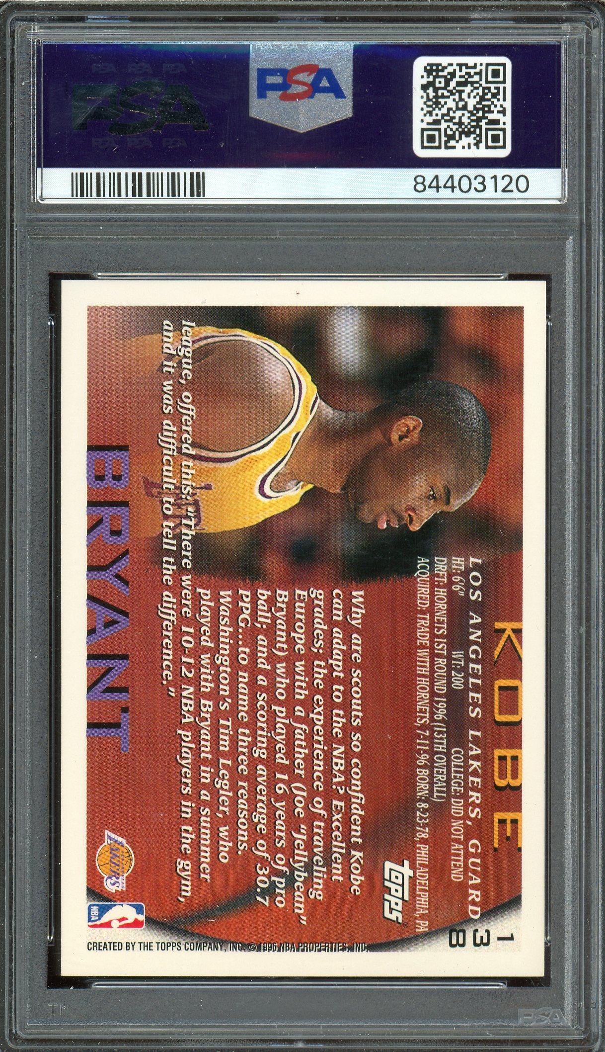 Kobe Bryant 1996 Topps Rookie Card #138 PSA Gem Mint 10!