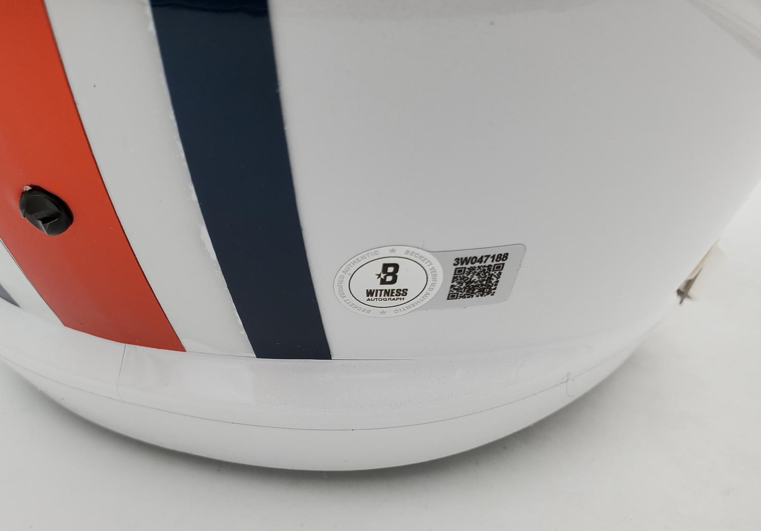 This autographed full size Riddell replica Speed helmet has been personally hand-signed by Bo Jackson of the Auburn Tigers. This autograph is certified by Beckett Authentication Services (BAS) Witness Certification. That means that a Beckett representative was present when this item was signed. It comes with the numbered authentication hologram with a QR code that verifies the authentication on the Beckett website. Please note, the hologram shifted slighty and left some behind, see the last picture.