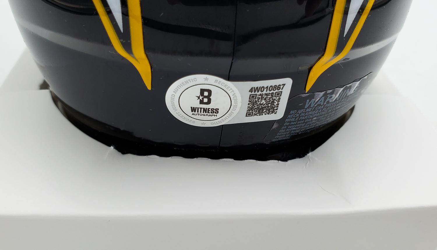 This autographed Riddell Speed mini helmet has been personally hand-signed by Ladainian Tomlinson "2006 NFL MVP" of the San Diego Chargers. This autograph is certified by Beckett Authentication Services (BAS) Witness Certification. That means that a Beckett representative was present when this item was signed. It comes with the numbered authentication hologram with a QR code that verifies the authentication on the Beckett website. Stock images are used for this listing. The item you will receive will be of equal quality to the one pictured. The signature location may vary slightly.