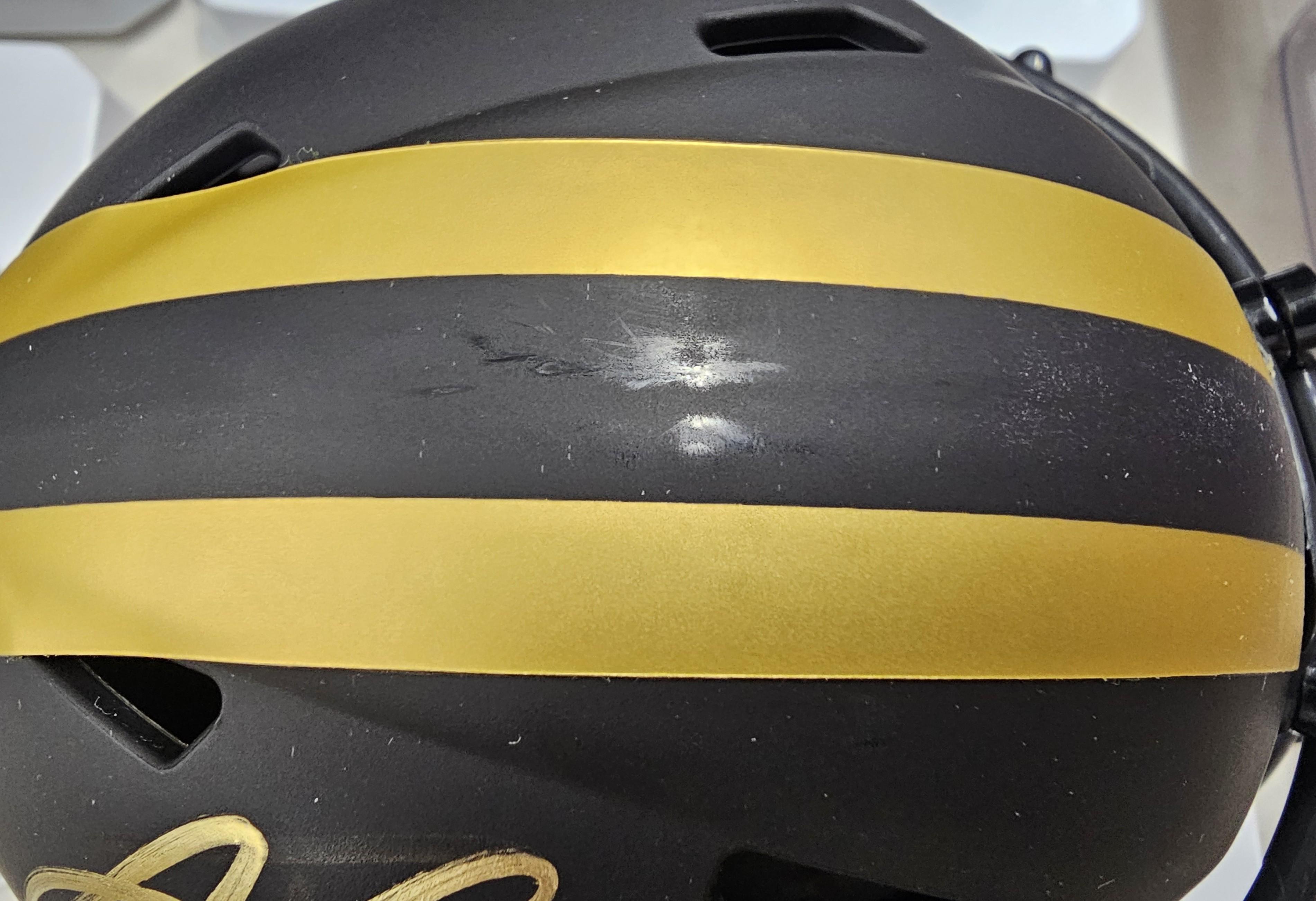 This autographed Riddell Speed mini helmet has been personally hand-signed by Fred Warner of the San Francisco 49ers. This autograph is certified by Beckett Authentication Services (BAS) Witness Certification. That means that a Beckett representative was present when this item was signed. It comes with the numbered authentication hologram with a QR code that verifies the authentication on the Beckett website. Stock images are used for this listing. The item you will receive will be of equal quality to the one pictured. The signature location may vary slightly. Please note, the sticker that Riddell puts at the top of the inside plastic has left a residue on the helmet. An example of the residue is pictured.
