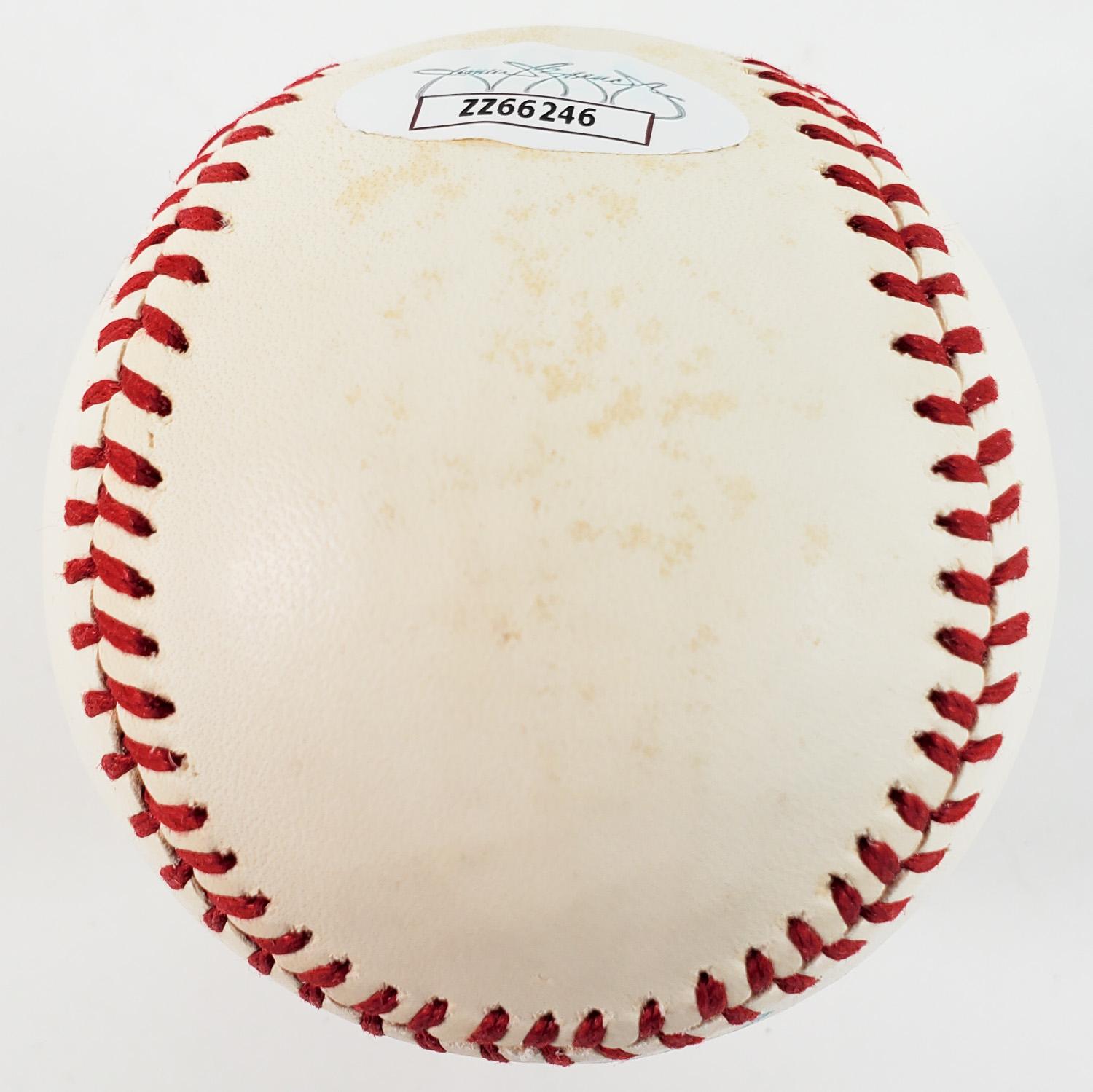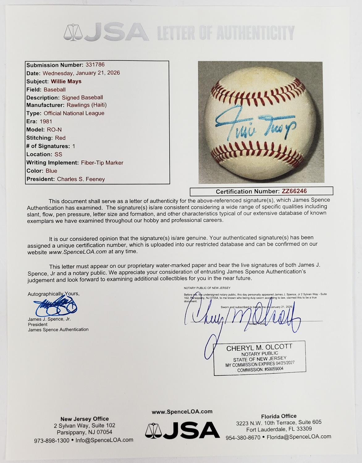 This autographed baseball has been personally hand-signed by Willie Mays of the San Francisco Giants. This autograph is certified by James Spence Authentication (JSA). It comes with the numbered hologram and matching Letter of Authenticity.