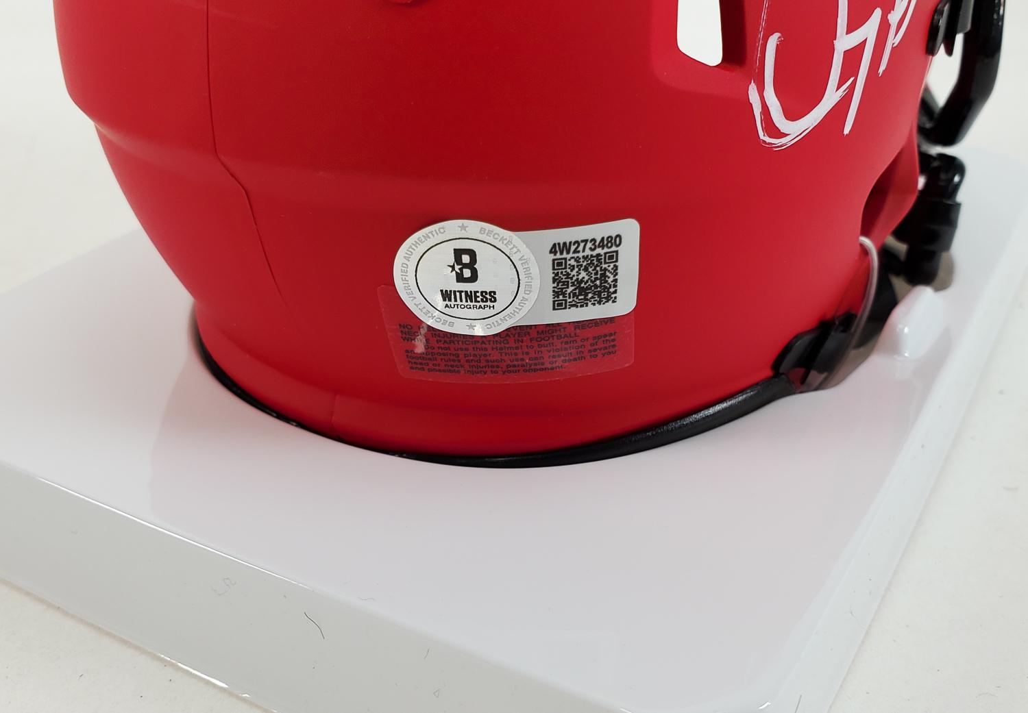 This autographed mini helmet has been personally hand-signed by Doug Flutie of the New England Patriots. This autograph is certified by Beckett Authentication Services (BAS) Witness Certification. That means that a Beckett representative was present when this item was signed. It comes with the numbered authentication hologram with a QR code that verifies the authentication on the Beckett website.