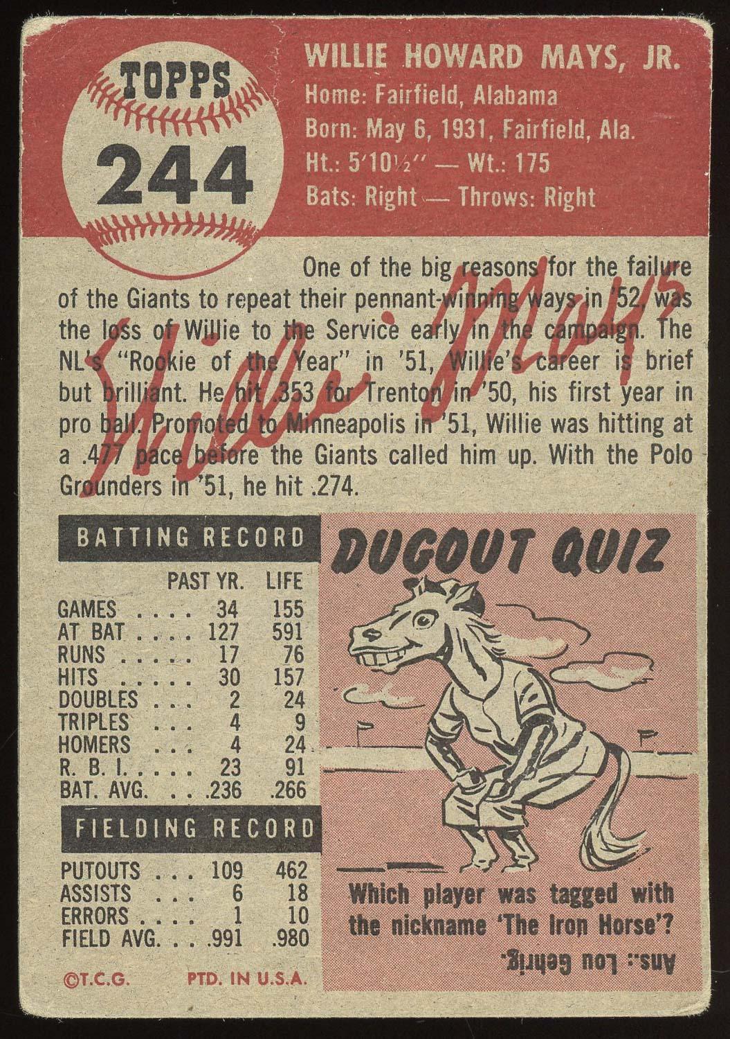 Willie Mays 1953 Topps Card #244. Please see pictures for details on the condition of this card.