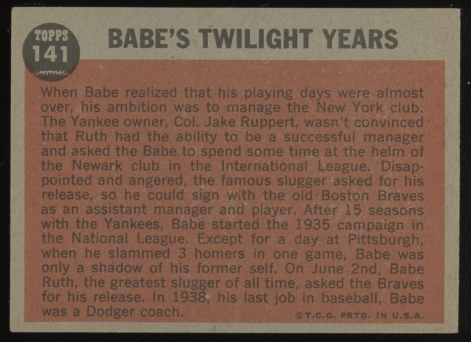 Babe Ruth 1962 Topps Babe Ruth Special Twilight Years Card #141
