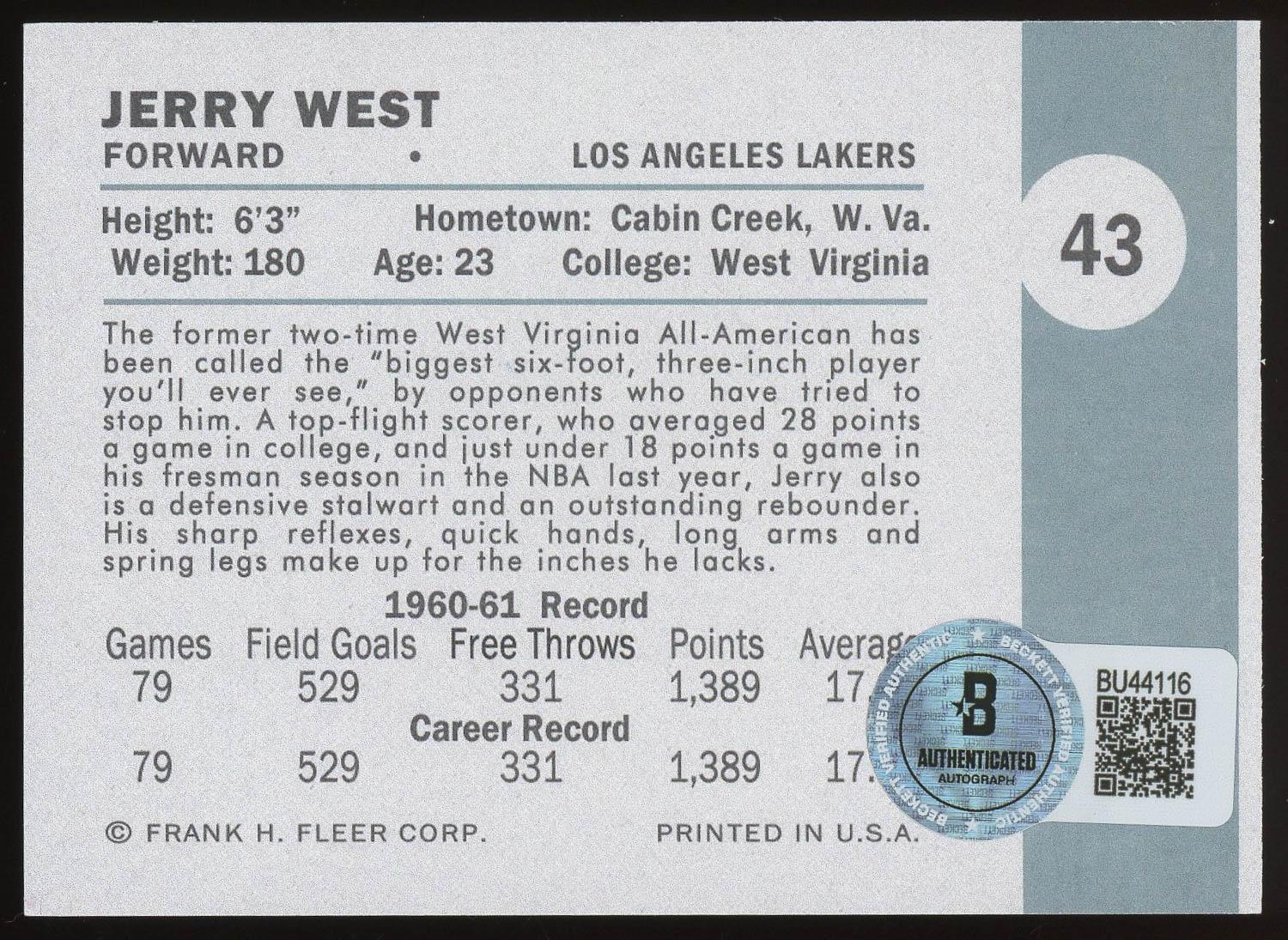 Jerry West Signed Reprint Card Beckett. This autograph is certified by Beckett Authentication Services (BAS). It comes with the numbered authentication hologram with a QR code that verifies the authentication on the Beckett website.Please see pictures for details on the condition of this card.