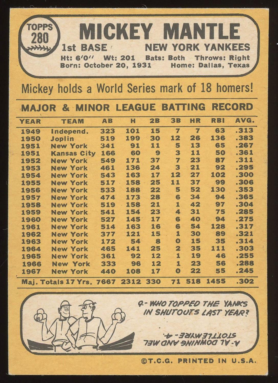 Mickey Mantle 1968 Topps Card #280. Please see pictures for details on the condition of this card.