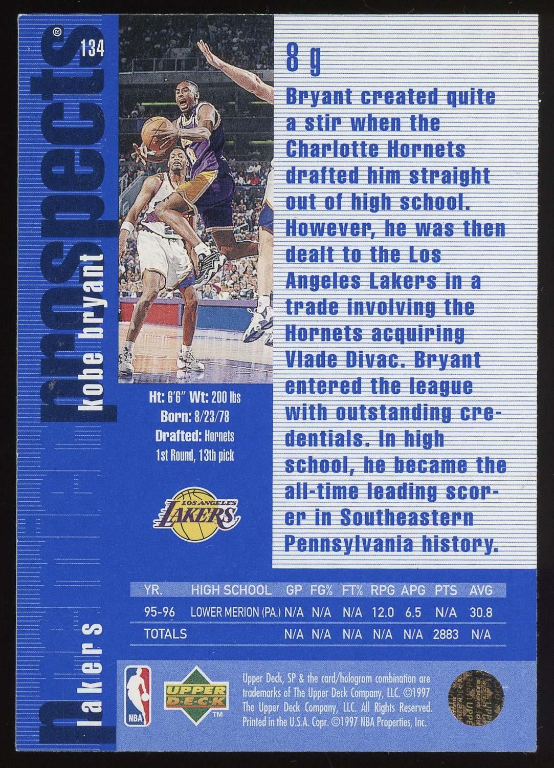 Kobe Bryant 1996 SP Premier Propects Rookie Card #134. Please see pictures for details on the condition of this card.