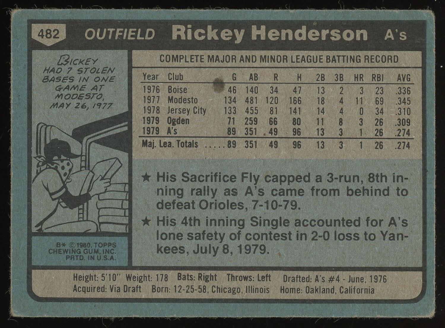Rickey Henderson 1980 Topps Rookie Card #482. Please see pictures for details on the condition of this card.