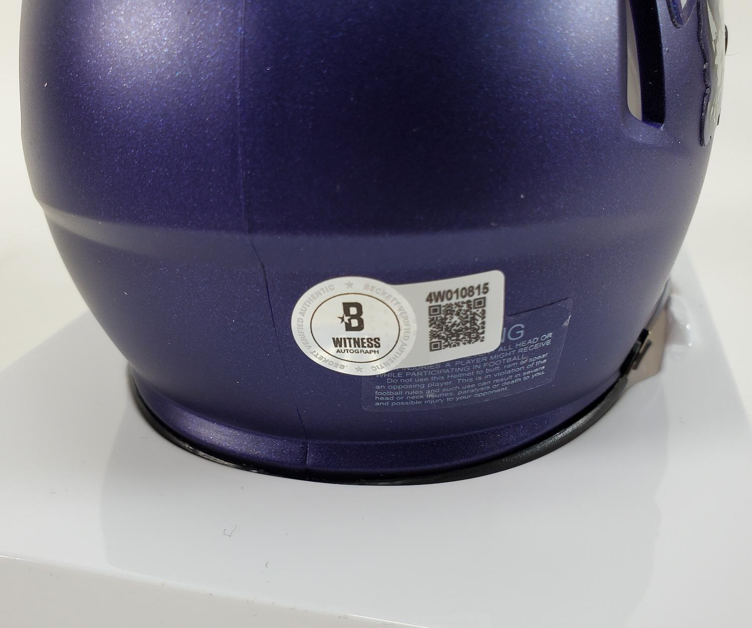 This autographed Riddell Speed mini helmet has been personally hand-signed by Ladainian Tomlinson of the TCU Horned Frogs. This autograph is certified by Beckett Authentication Services (BAS) Witness Certification. That means that a Beckett representative was present when this item was signed. It comes with the numbered authentication hologram with a QR code that verifies the authentication on the Beckett website. Stock images are used for this listing. The item you will receive will be of equal quality to the one pictured. The signature location may vary slightly.