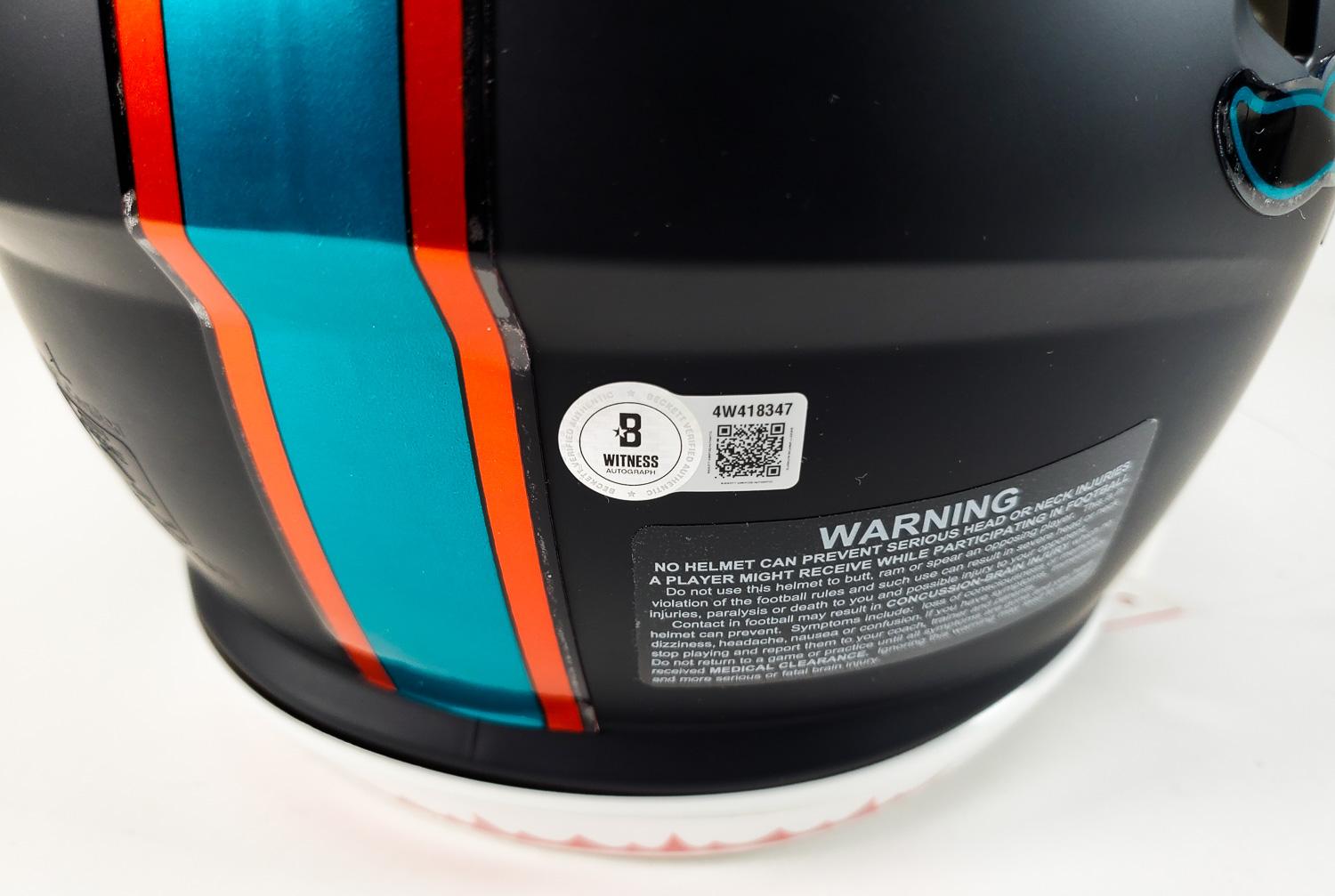 This autographed full size Riddell Authentic Speed helmet has been personally hand-signed by De'Von Achane of the Miami Dolphins. This autograph is certified by Beckett Authentication Services (BAS) Witness Certification. That means that a Beckett representative was present when this item was signed. It comes with the numbered authentication hologram with a QR code that verifies the authentication on the Beckett website.