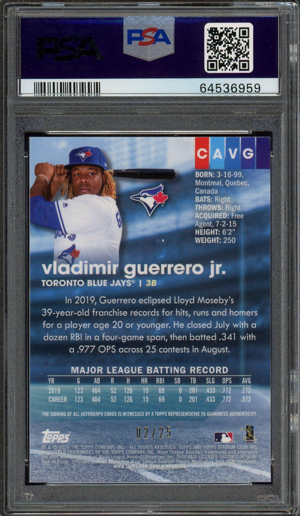 Vladimir Guerrero Jr. 2020 Topps Stadium Club Chrome Orange Refractor Auto Card /25 PSA 9: POP 2, 7 Higher!