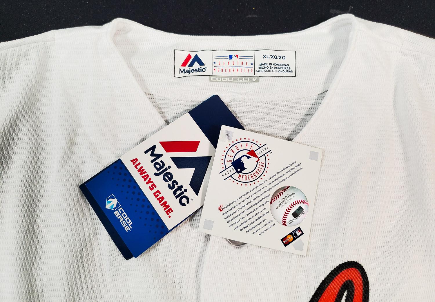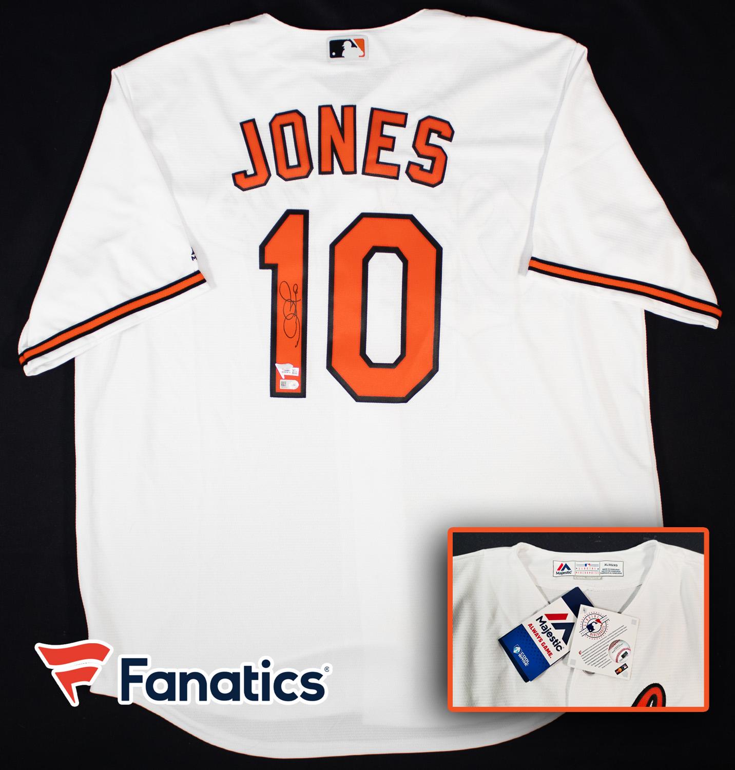 This autographed Majestic jersey has been personally hand-signed by Adam Jones of the Baltimore Orioles. This autograph is certified by Fanatics. It comes with the numbered hologram which can be verified on Fanatics.com. This autograph is also certified by Major League Baseball (MLB). It comes with the numbered hologram which can be verified on the MLB website, MLB.com.