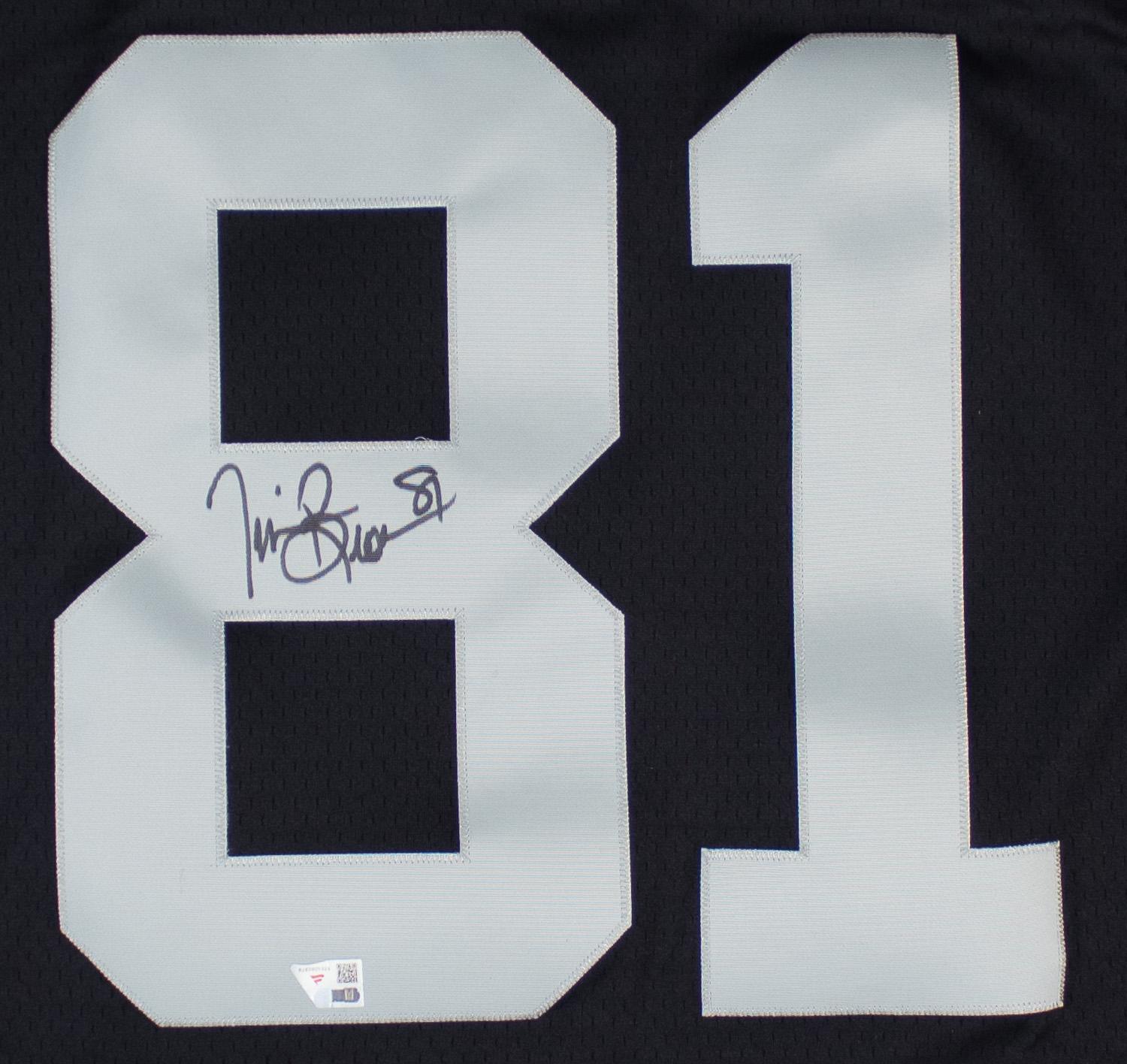 This autographed Mitchell & Ness jersey has been personally hand-signed by Tim Brown of the Oakland Raiders. This autograph is certified by Fanatics. It comes with the numbered hologram which can be verified on Fanatics.com.