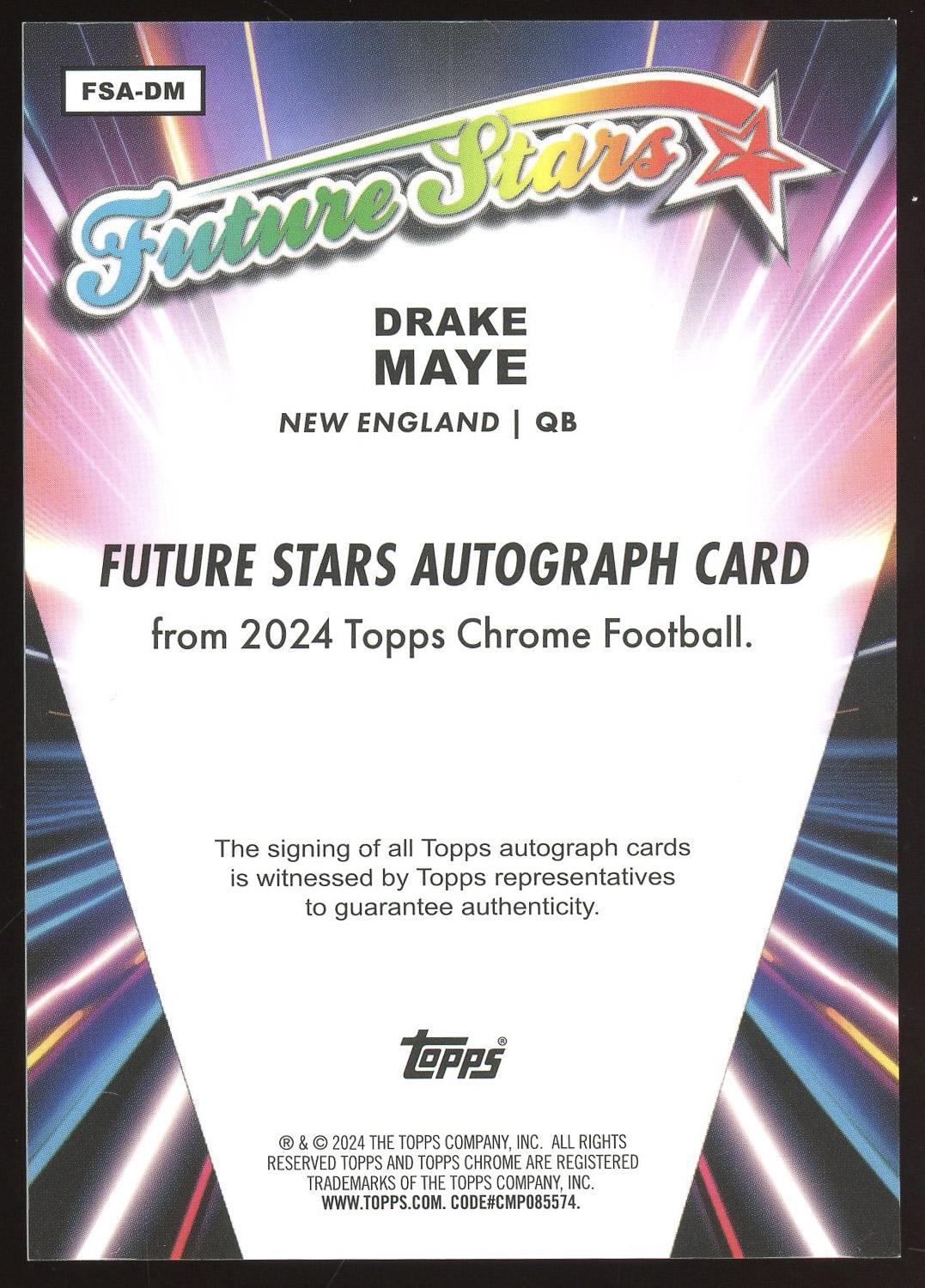 Drake Maye 2024 Topps Chrome Future Stars Rookie Auto Card. Please see pictures for details on the condition of these cards.