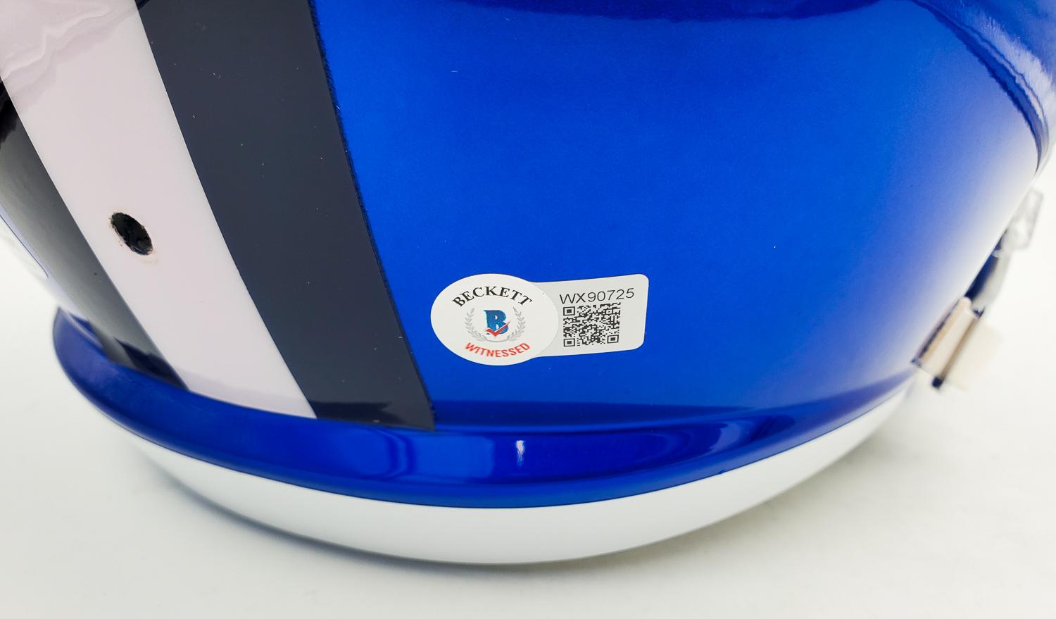 This autographed full size helmet has been personally hand-signed by Troy Aikman of the Dallas Cowboys. This autograph is certified by Beckett Authentication Services (BAS) Witness Certification. That means that a Beckett representative was present when this item was signed. It comes with the numbered authentication hologram with a QR code that verifies the authentication on the Beckett website.