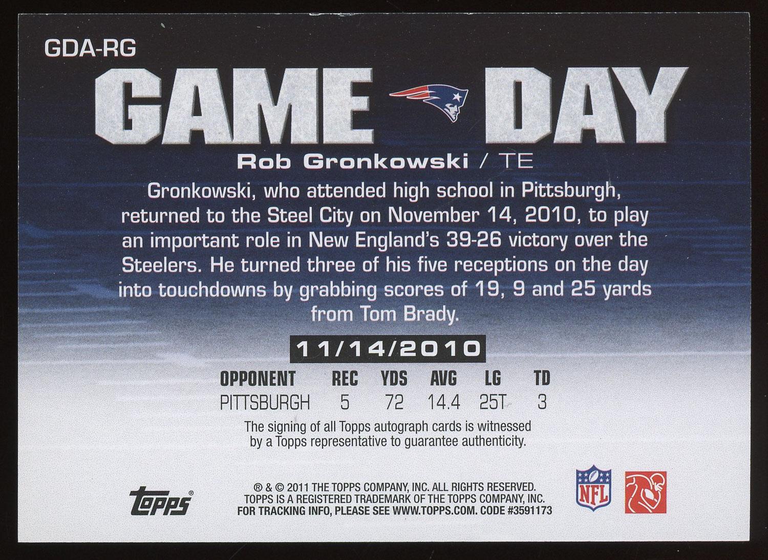 Rob Gronkowski 2011 Topps Game Day Auto Card