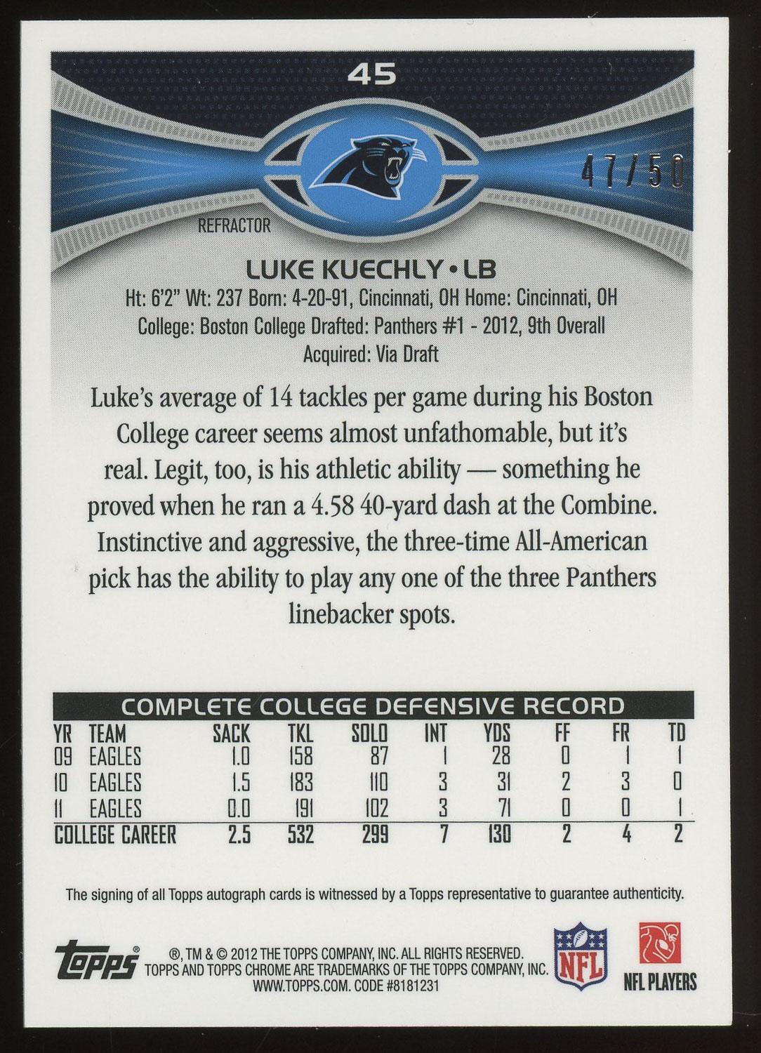 Luke Keuchly 2012 Topps Chrome Aqua SSP Refractor Rookie Auto Card /50. Please see pictures for details on the condition of this card.