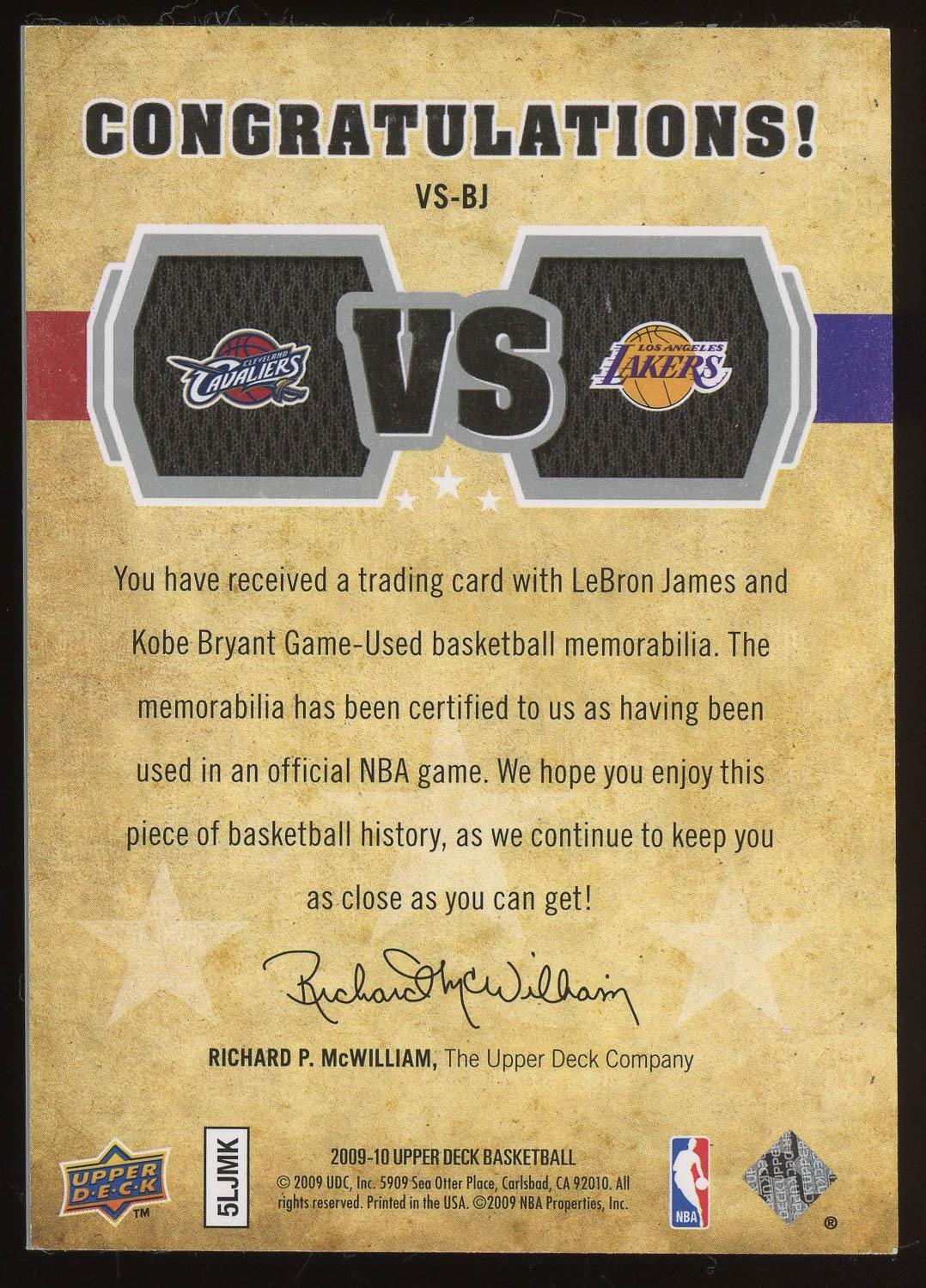 LeBron James & Kobe Bryant 2009 Upper Deck vs. Materials Game Used Patch Card /600