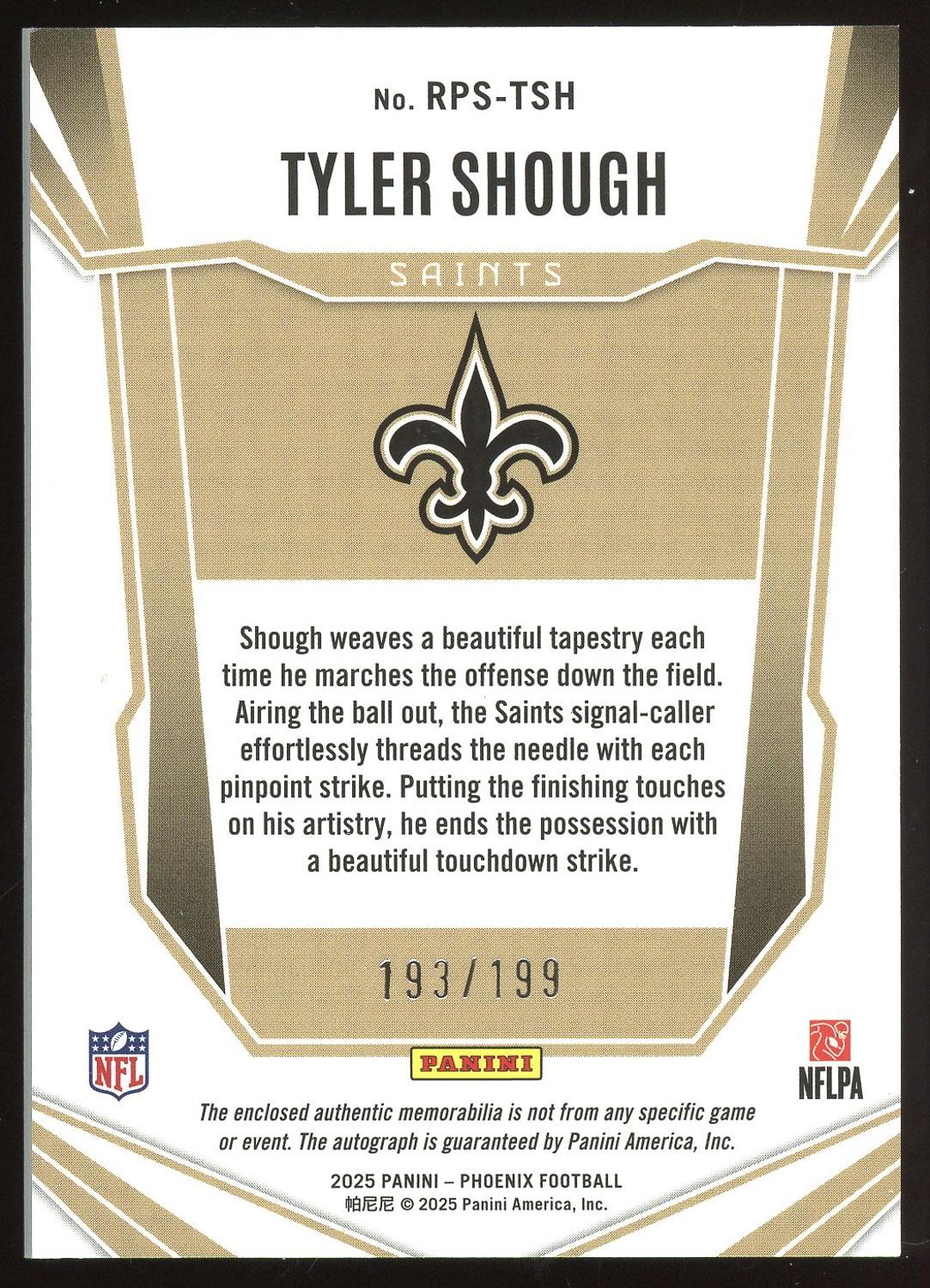 Tyler Shough 2025 Panini Phoenix Rookie Patch Auto Card /199. Please see pictures for details on the condition of these cards.