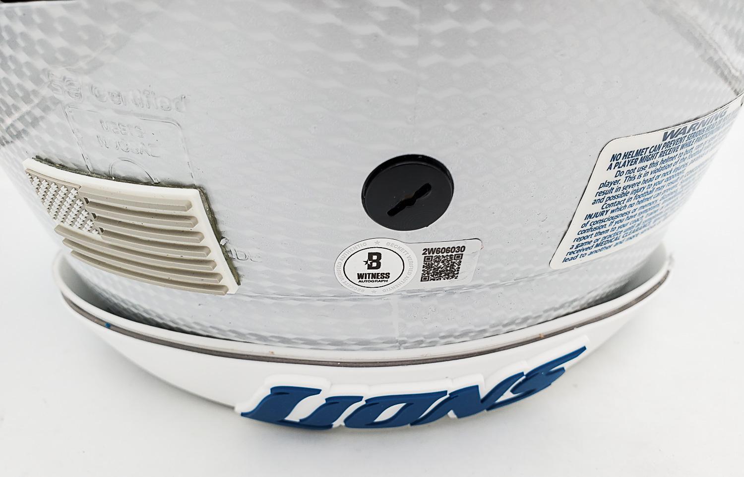 This autographed full size Riddell SpeedFlex authentic speed helmet has been personally hand-signed by Jameson Williams & Sam LaPorta of the Detroit Lions. These autographs are certified by Beckett Authentication Services (BAS) Witness Certification. That means that a Beckett representative was present when this item was signed. It comes with the numbered authentication hologram with a QR code that verifies the authentication on the Beckett website.