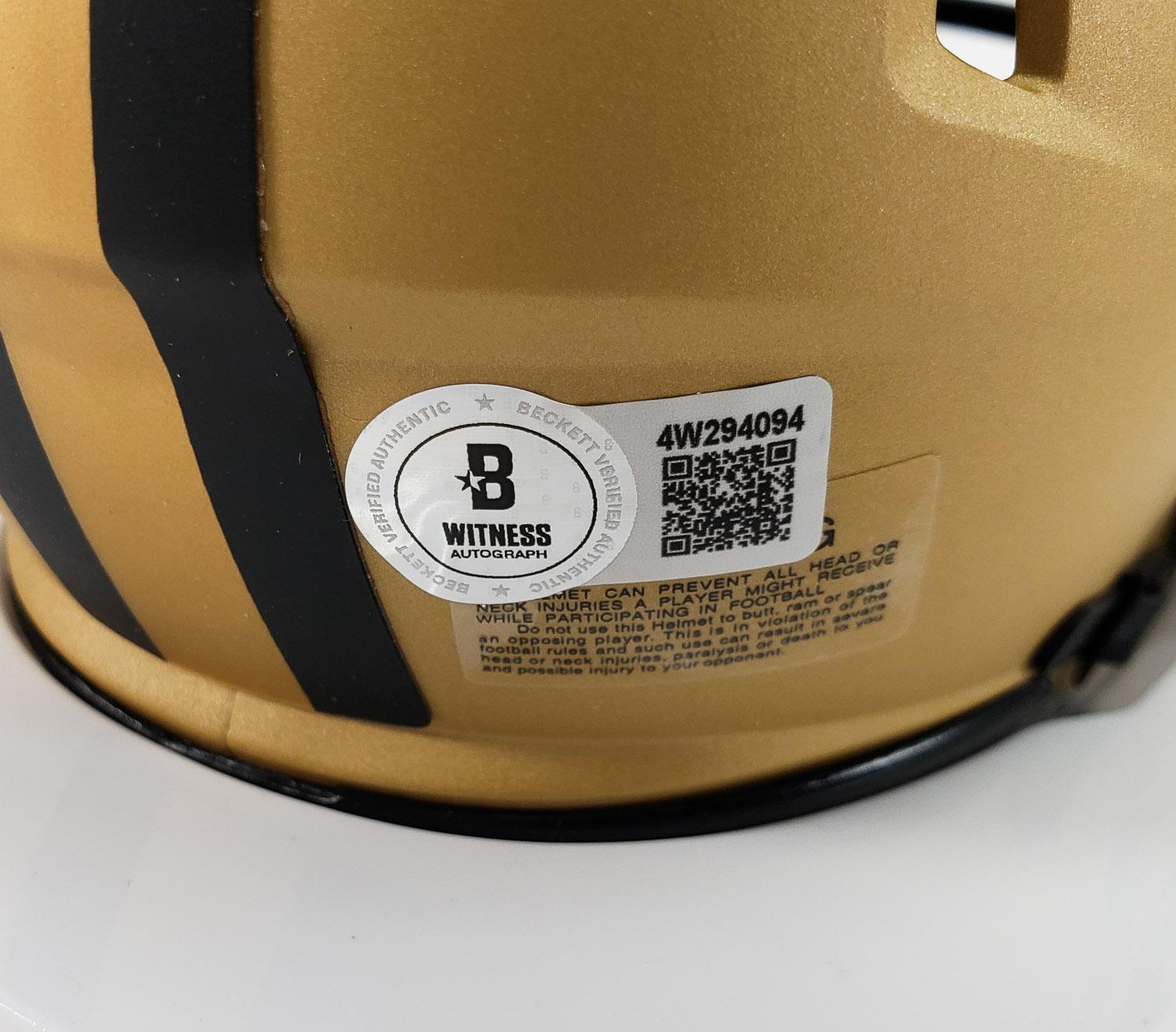This autographed Riddell Speed mini helmet has been personally hand-signed by Fred Warner of the San Francisco 49ers. This autograph is certified by Beckett Authentication Services (BAS) Witness Certification. That means that a Beckett representative was present when this item was signed. It comes with the numbered authentication hologram with a QR code that verifies the authentication on the Beckett website. Stock images are used for this listing. The item you will receive will be of equal quality to the one pictured. The signature location may vary slightly.