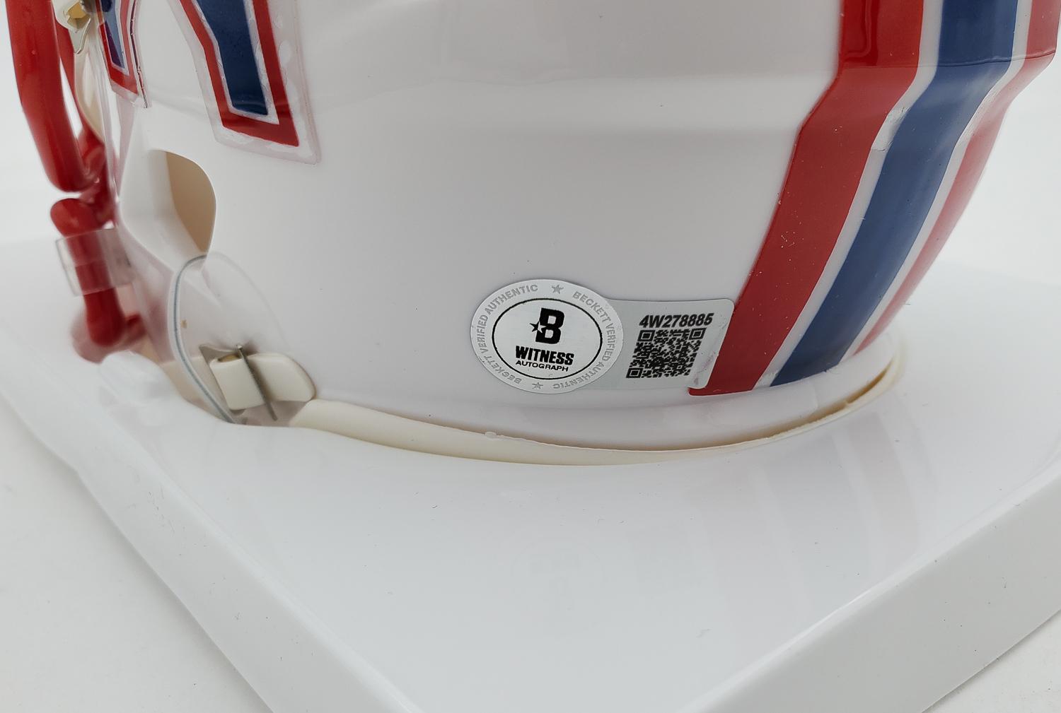 This autographed Riddell Speed mini helmet has been personally hand-signed by Warren Moon "HOF 06" of the Houston Oilers. This autograph is certified by Beckett Authentication Services (BAS) Witness Certification. That means that a Beckett representative was present when this item was signed. It comes with the numbered authentication hologram with a QR code that verifies the authentication on the Beckett website. Stock images are used for this listing. The item you will receive will be of equal quality to the one pictured. The signature location may vary slightly.