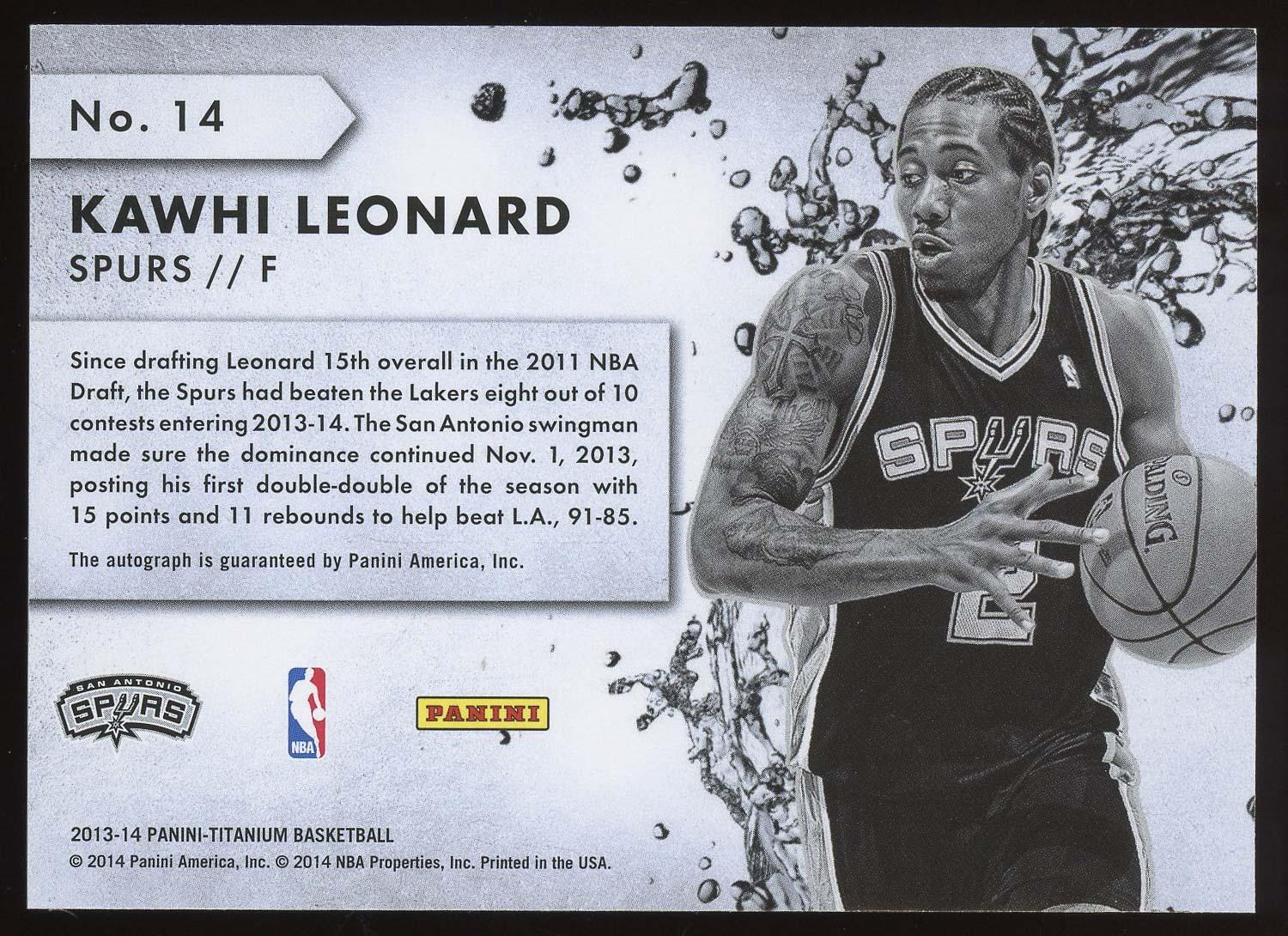 Kawhi Leonard 2013 Panini Titanium New Wave Auto Card. Please see pictures for details on the condition of this card.