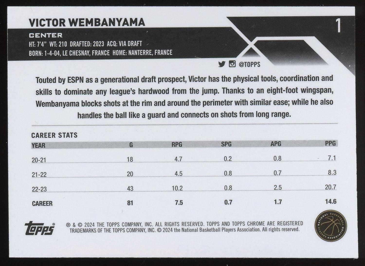 Victor Wembanyama 2024 Topps Chrome Blue Basketball Rookie Card #1
