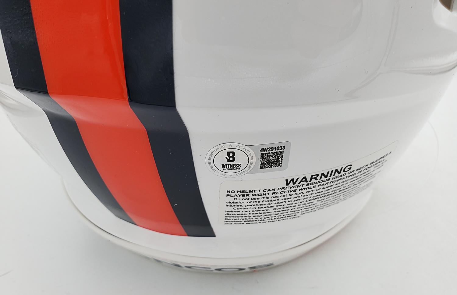 This autographed full size Riddell authentic Speed helmet has been personally hand-signed by Bo Nix of the Denver Broncos. This autograph is certified by Beckett Authentication Services (BAS) Witness Certification. That means that a Beckett representative was present when this item was signed. It comes with the numbered authentication hologram with a QR code that verifies the authentication on the Beckett website.