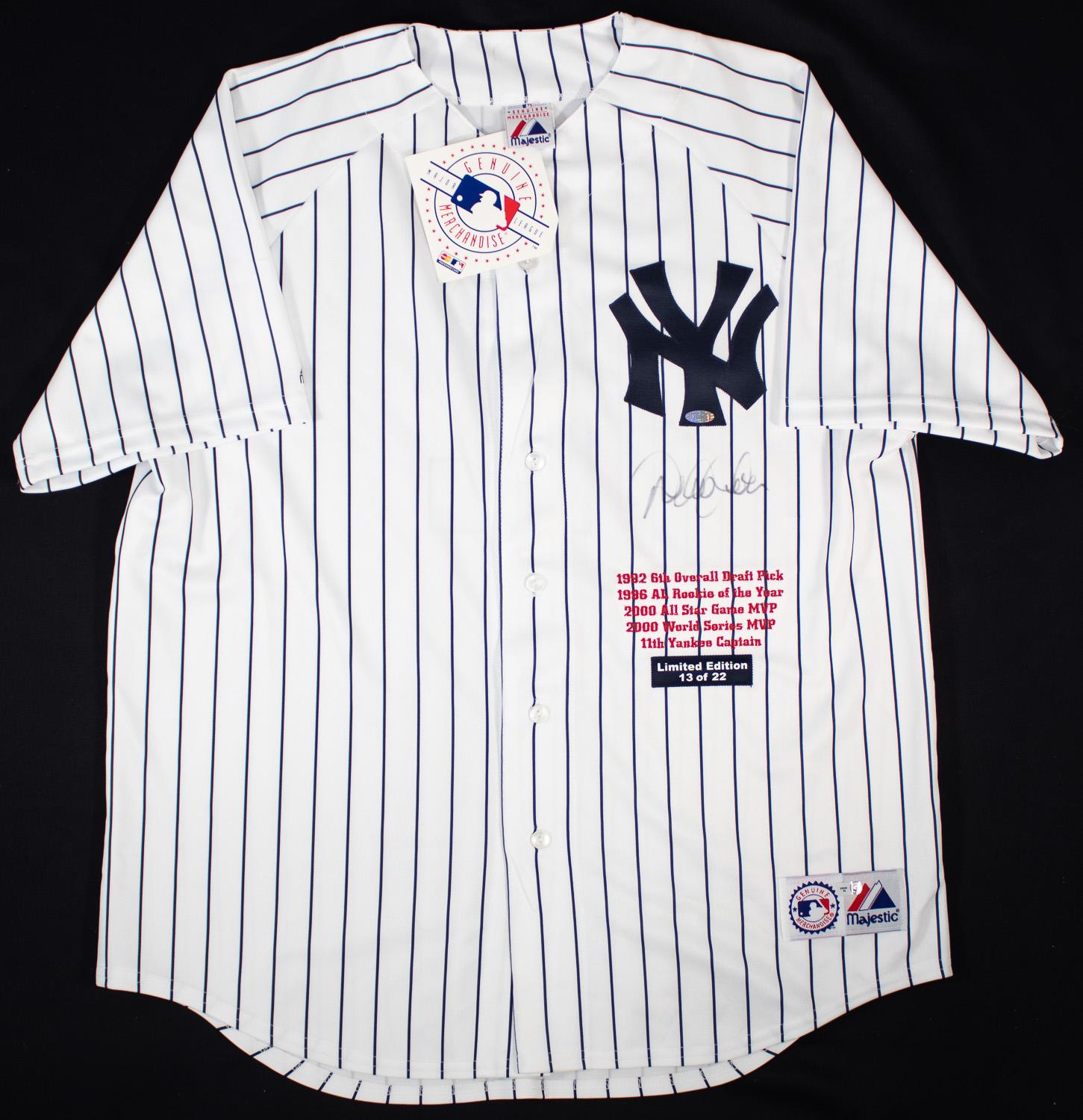 This autographed Majestic jersey has been personally hand-signed by Derek Jeter of the New York Yankees. This autograph is certified by Major League Baseball (MLB). It comes with the numbered hologram which can be verified on the MLB website, MLB.com. It is also certified by Steiner Sports and comes with the authentication hologram and COA.