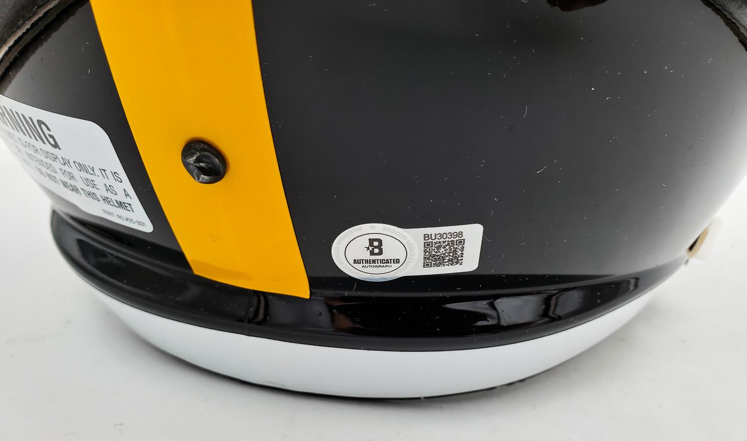 This autographed full size helmet has been personally hand-signed by Terry Bradshaw of the Pittsburgh Steelers. This autograph is certified by Beckett Authentication Services (BAS) Certification. It comes with the numbered authentication hologram with a QR code that verifies the authentication on the Beckett website.