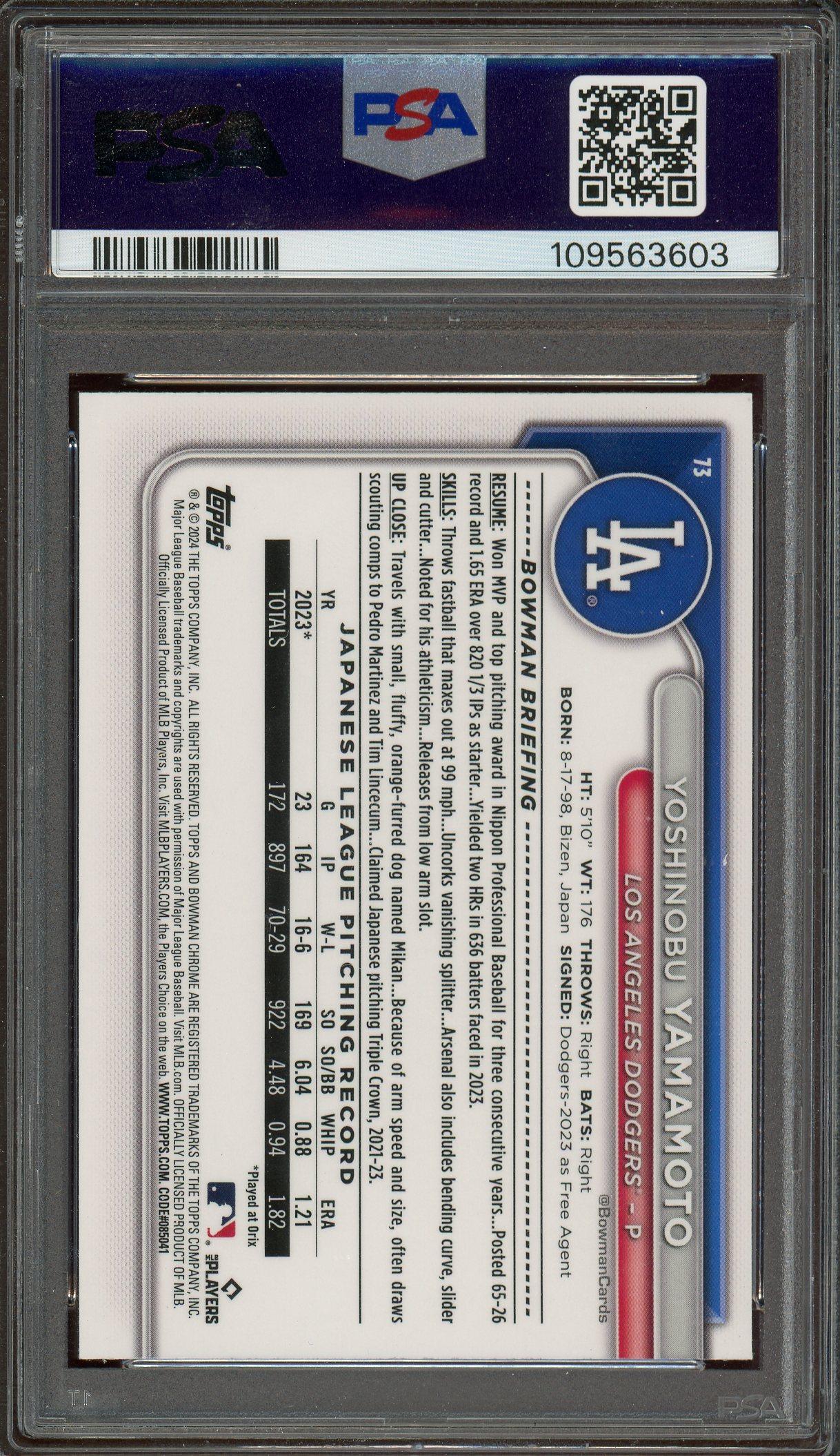 Yoshinobu Yamamoto 2024 Bowman Chrome Wave Refractor Rookie Card /100 PSA 9: POP 10, 2 Higher!