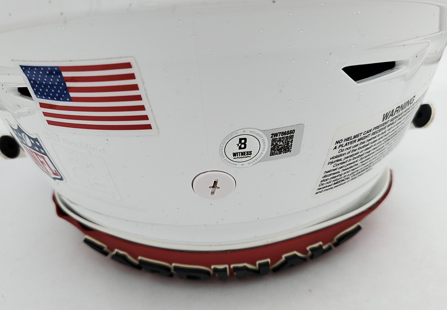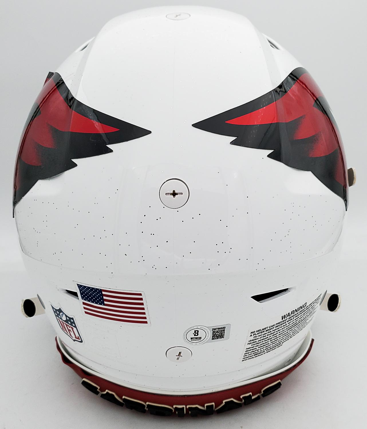 This autographed full size Riddell SpeedFlex authentic speed helmet has been personally hand-signed by Josh Sweat "Make Em Sweat" & "Protect the Nest" of the Arizona Cardinals. This autograph is certified by Beckett Authentication Services (BAS) Witness Certification. That means that a Beckett representative was present when this item was signed. It comes with the numbered authentication hologram with a QR code that verifies the authentication on the Beckett website. The "Protect the Nest" inscription is partially blocked by the Oakley visor logo.