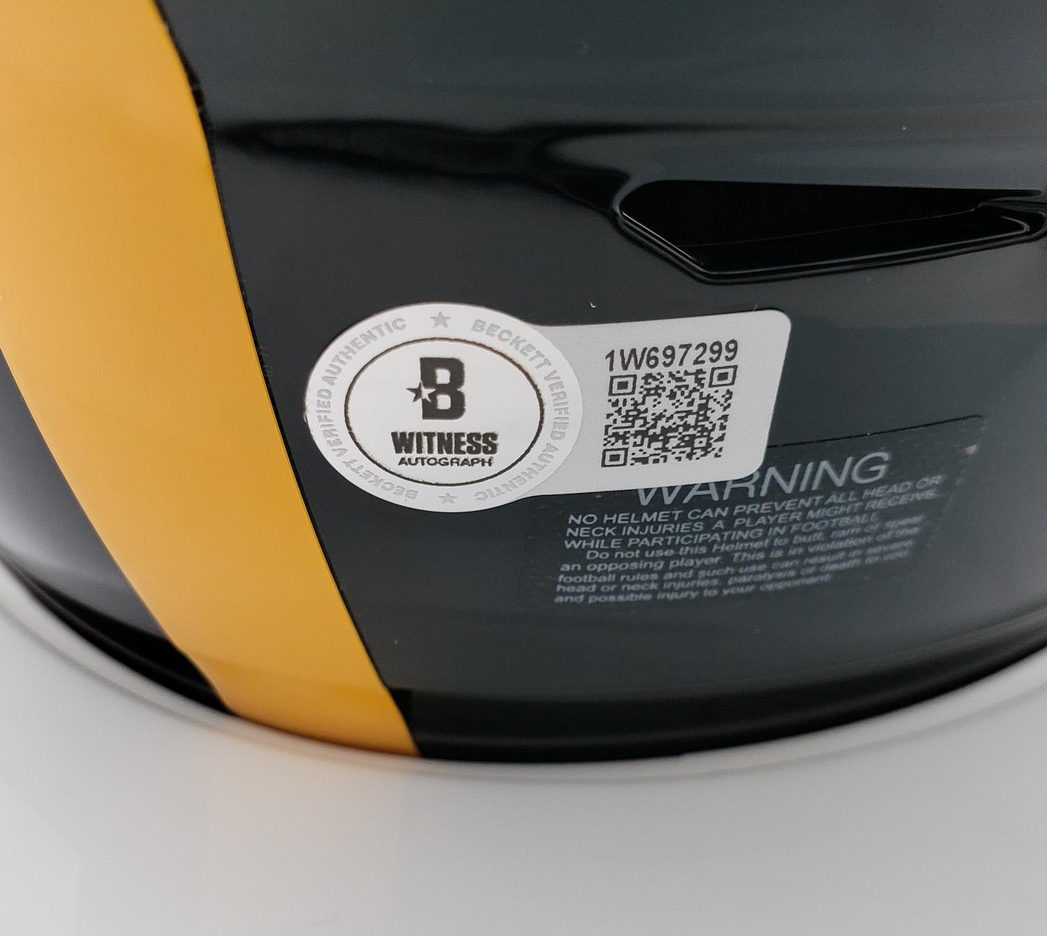 This autographed Riddell mid size MIDI helmet has been personally hand-signed by Terry Bradshaw of the Pittsburgh Steelers. This autograph is certified by Beckett Authentication Services (BAS) Witness Certification. That means that a Beckett representative was present when this item was signed. It comes with the numbered authentication hologram with a QR code that verifies the authentication on the Beckett website. Stock images are used for this listing. The item you will receive will be of equal quality to the one pictured. The signature location may vary slightly.