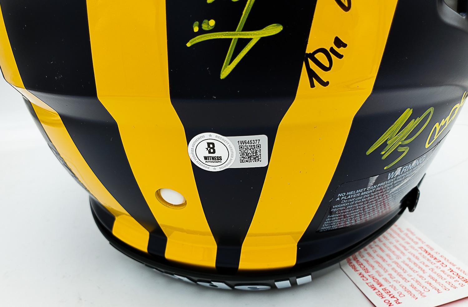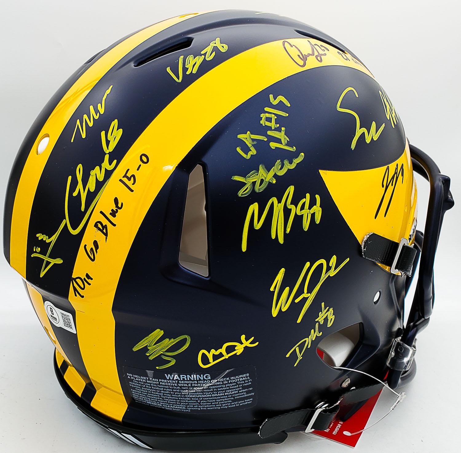 Authentic Helmet: 2023 Michigan Wolverines Natl Champ Team (x16 w/ JJ McCarthy, Blake Corum, Colston Loveland) Signed Full Size Speed Authentic Helmet (Beckett Witness Certified)