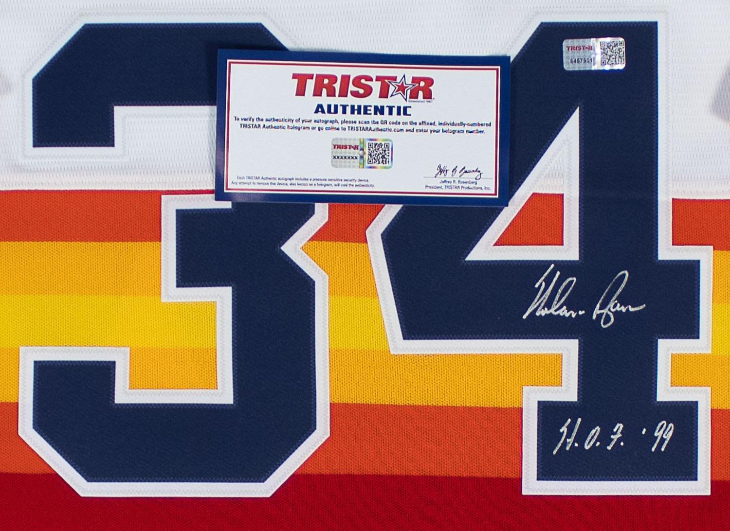 This autographed Nike jersey has been personally hand-signed by Nolan Ryan "HOF 99" of the Houston Astros. This autograph is certified by Tristar. It comes with the numbered hologram which can be verified on the Tristar website, tristarauthentic.com.