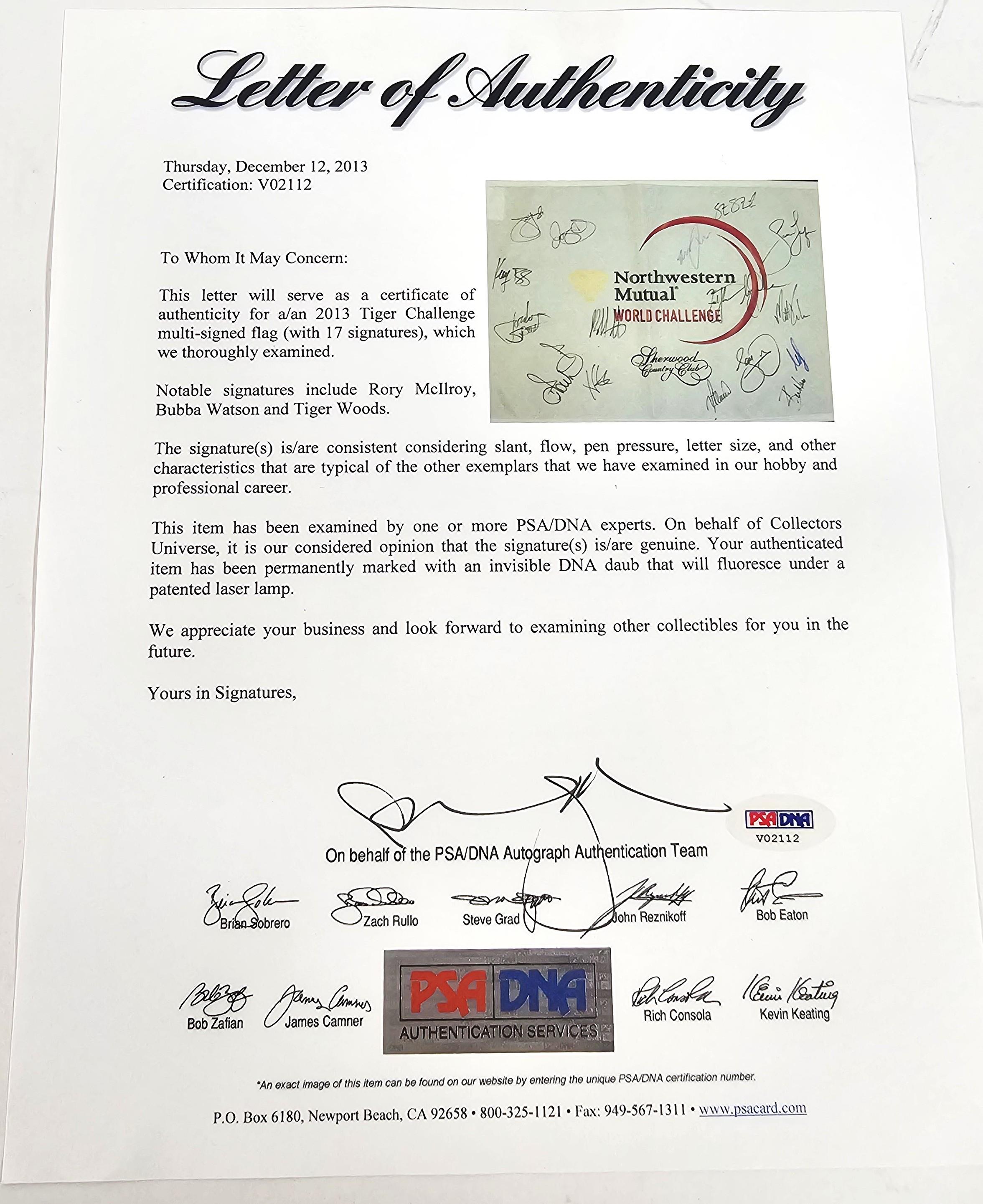 This autographed golf flag has been personally hand-signed by 17 golfers including Tiger Woods, Bubba Watson & Rory McIlroy. The frame measures 26.5x29 inches. This autograph is certified by PSA/DNA (Professional Sports Authenticators). It comes with the numbered authentication hologram which can be verified on the PSA website, psacard.com. It comes with the PSA/DNA Letter of Authenticity.