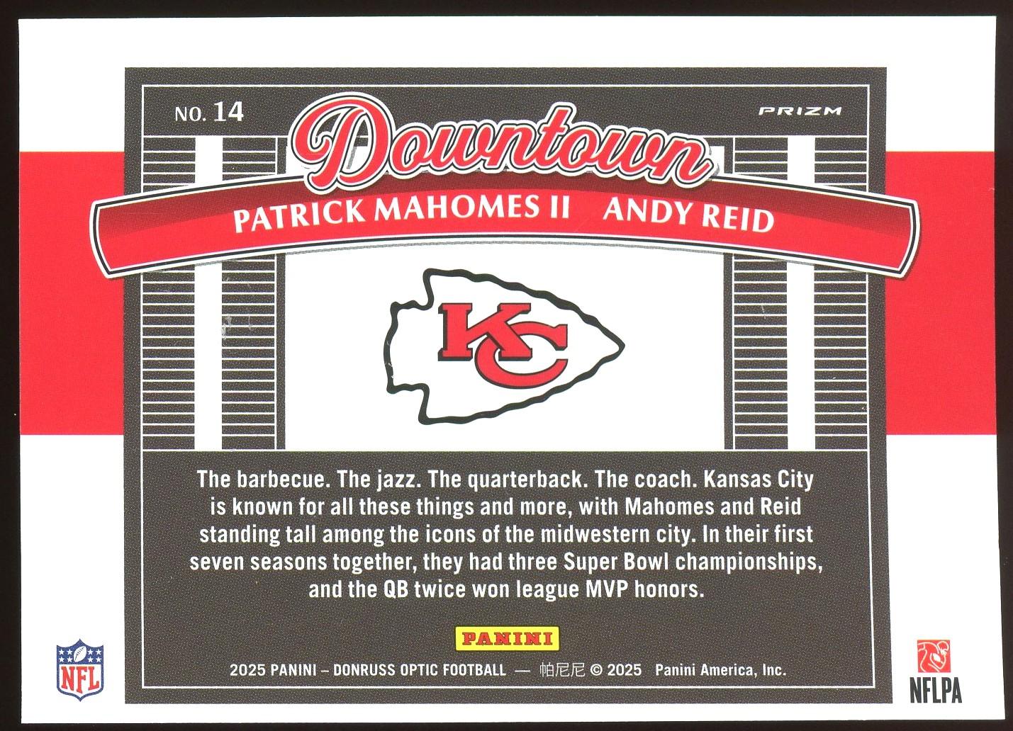 Patrick Mahomes & Andy Reid 2025 Donruss Optic Downtown Case Hit Card