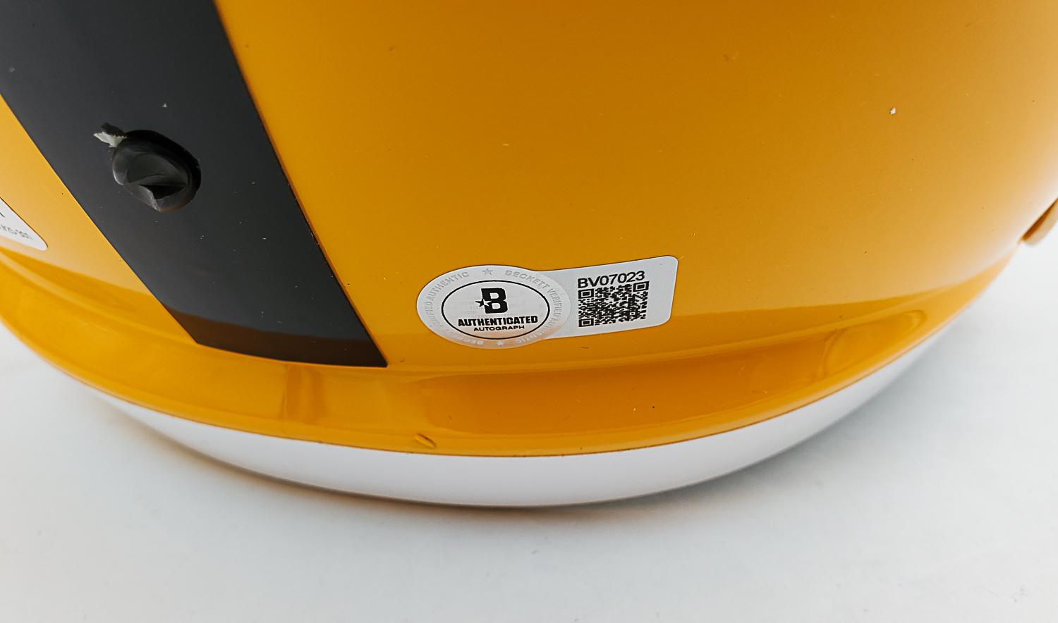 This autographed full size helmet has been personally hand-signed by Terry Bradshaw of the Pittsburgh Steelers. This autograph is certified by Beckett Authentication Services (BAS) Certification. It comes with the numbered authentication hologram with a QR code that verifies the authentication on the Beckett website.