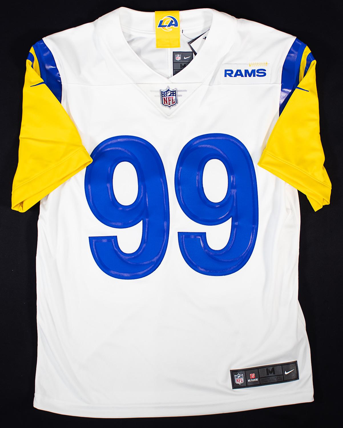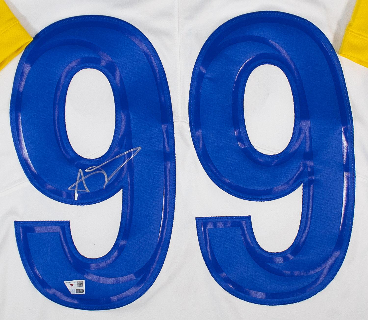 This autographed Nike NFL Authentic Limited jersey has been personally hand-signed by Aaron Donald of the Los Angeles Rams. This autograph is certified by Fanatics. It comes with the numbered hologram which can be verified on Fanatics.com.