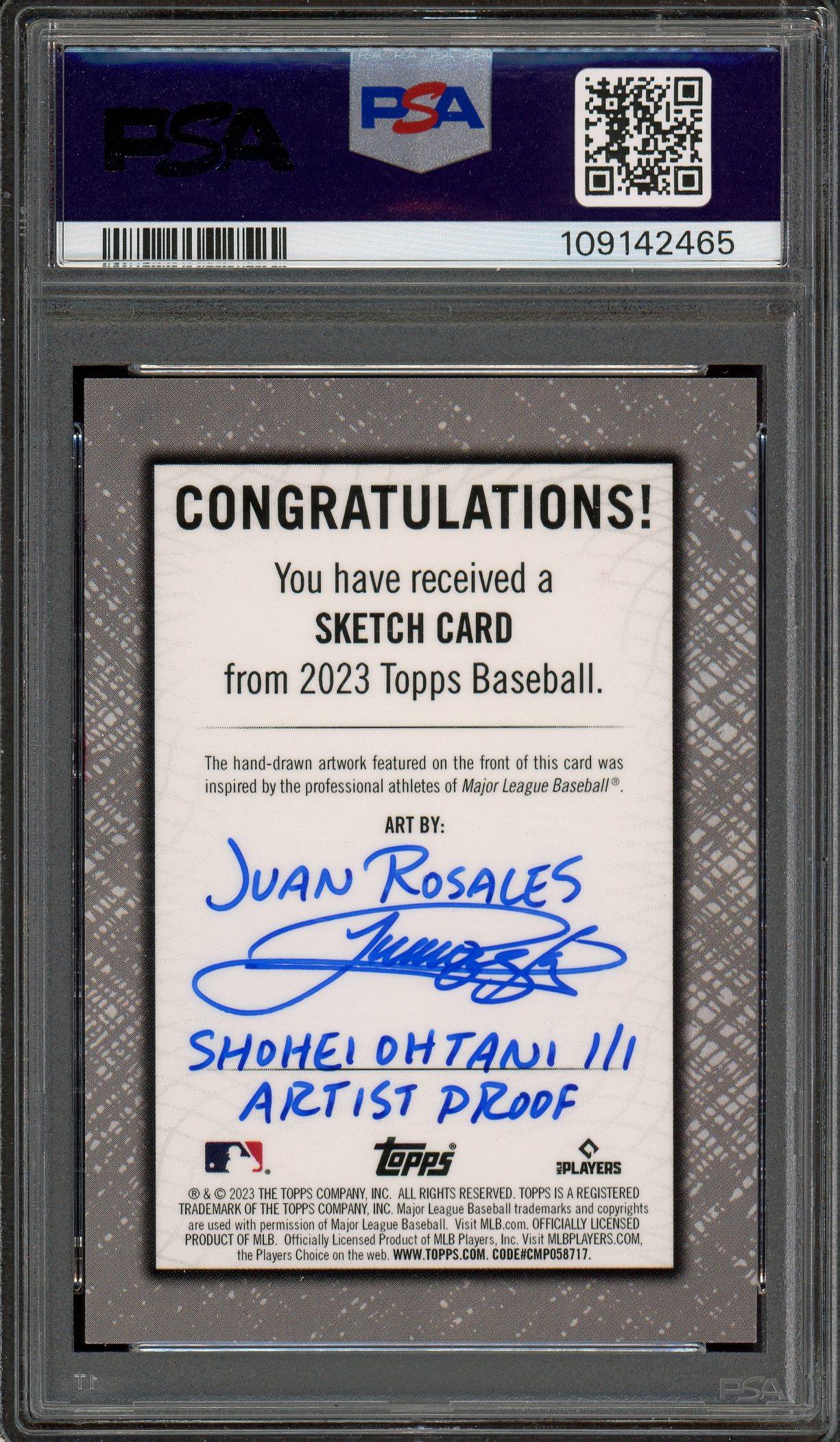Shohei Ohtani 2023 Topps Artist Proof 1/1 Sketch Card PSA Gem Mint 10 POP 3! Sketch done by Juan Rosales, who signed the back of the card.
