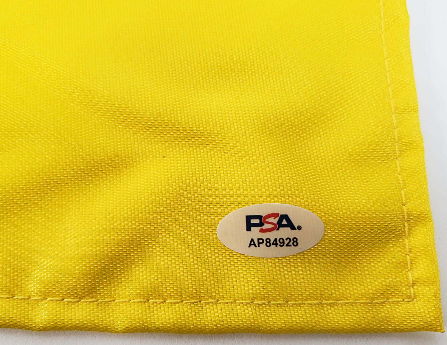 This autographed flag has been personally hand-signed by The Golden Bear, Jack Nicklaus. This autograph is certified by PSA/DNA (Professional Sports Authenticators). It comes with the numbered authentication hologram which can be verified on the PSA website, psacard.com. The signature has bled into the flag.