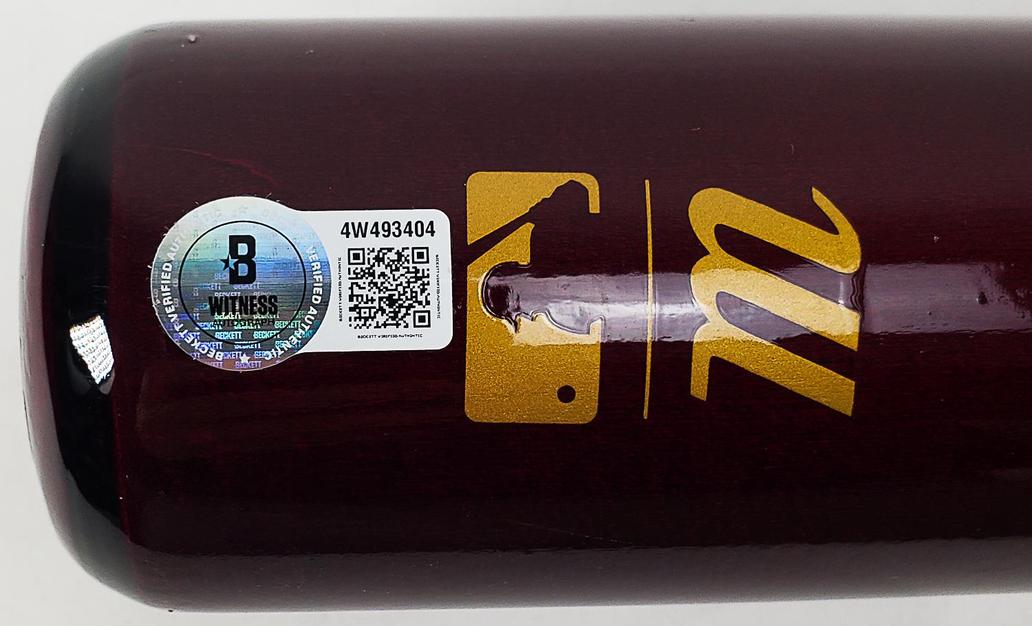 This autographed baseball bat has been personally hand-signed by Elly De La Cruz of the Cincinnati Reds. This autograph is certified by Beckett Authentication Services (BAS) Witness Certification. That means that a Beckett representative was present when this item was signed. It comes with the numbered authentication hologram with a QR code that verifies the authentication on the Beckett website.