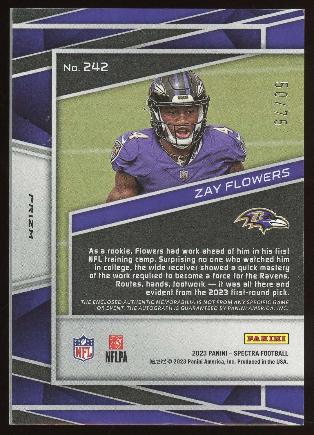Zay Flowers 2023 Panini Spectra Patch Auto Card /75. Please see pictures for details on the condition of this card.