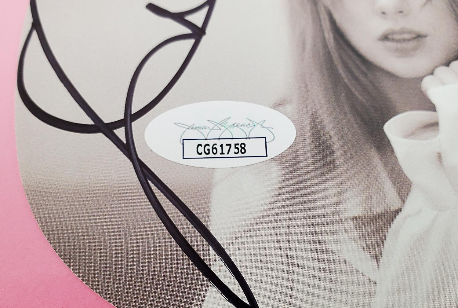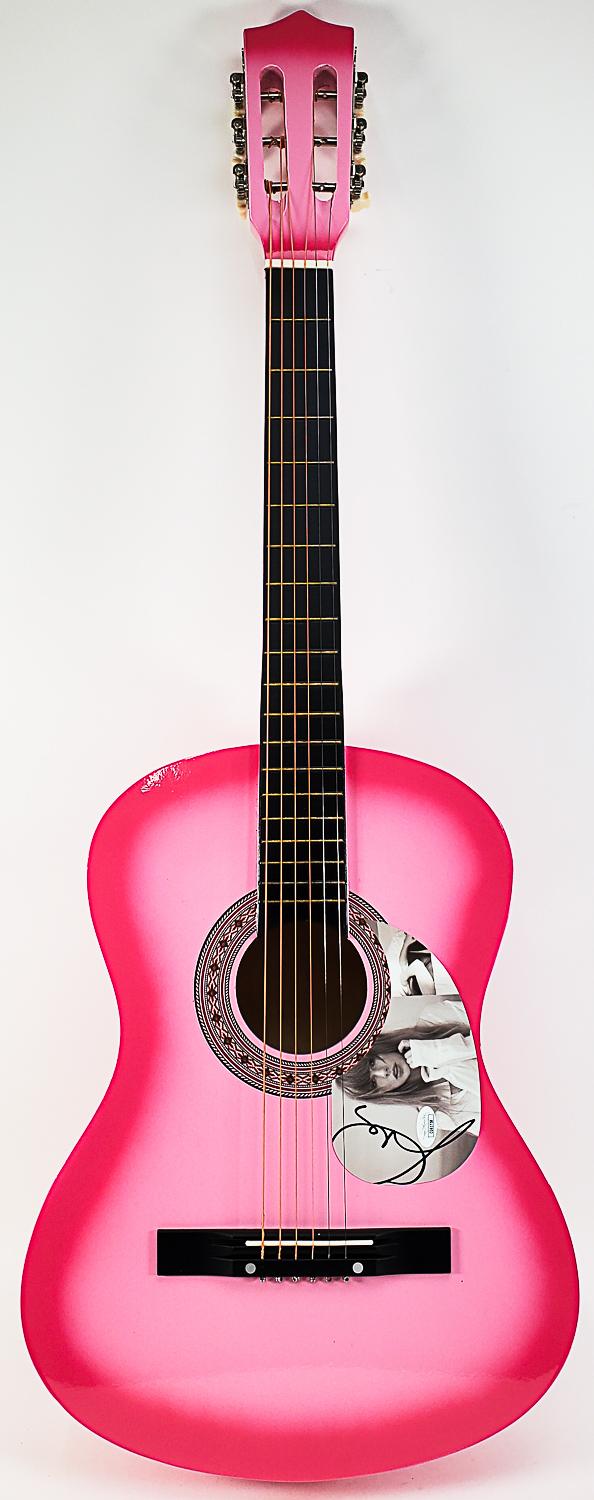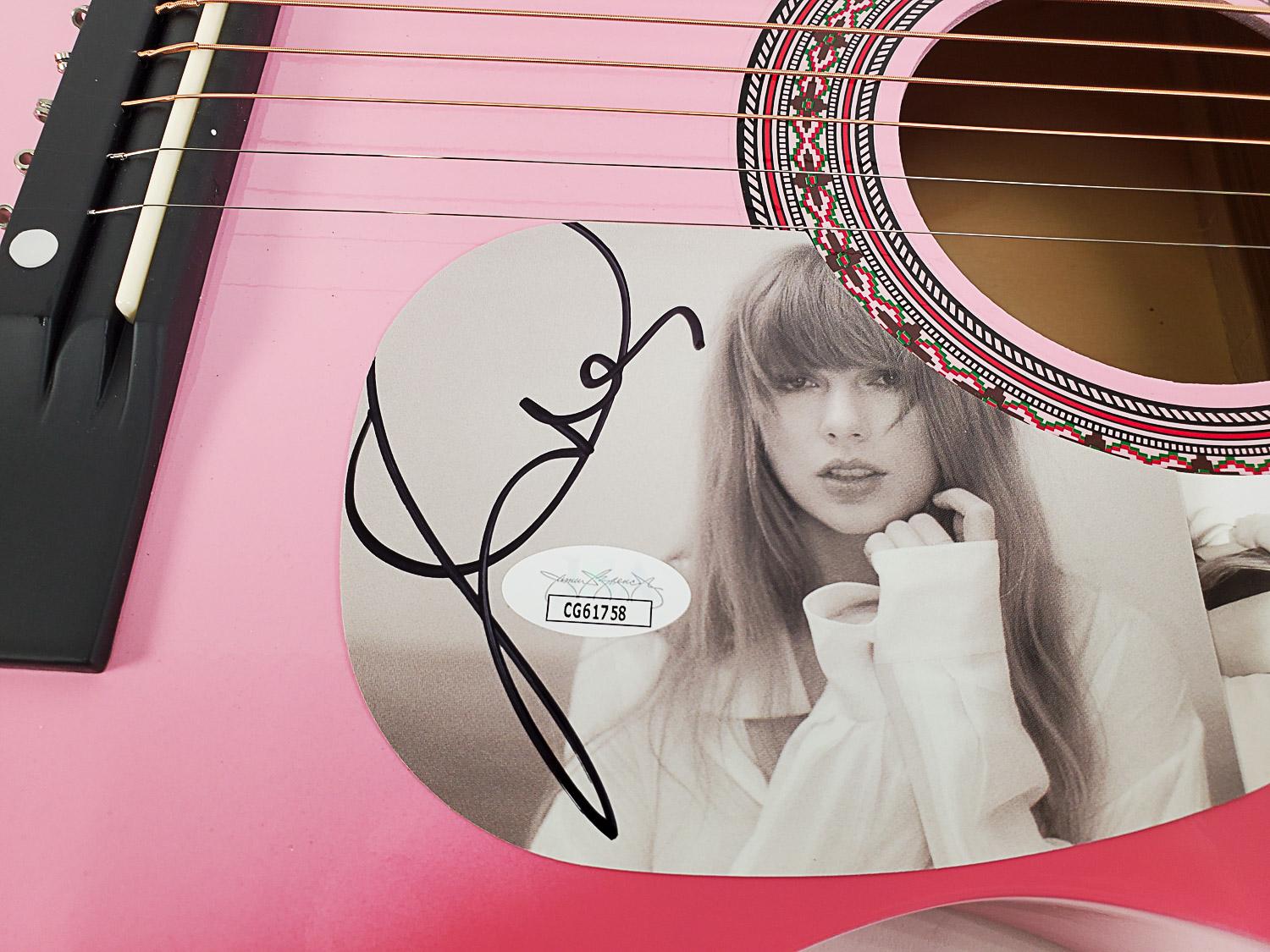 This autographed generic acoustic guitar has been personally hand-signed by Taylor Swift. This autograph is certified by James Spence Authentication (JSA). It comes with the numbered hologram for Authenticity. The signed pickguard is a cutout of a signed CD cover and part of another page glued together to make a pickguard shape.