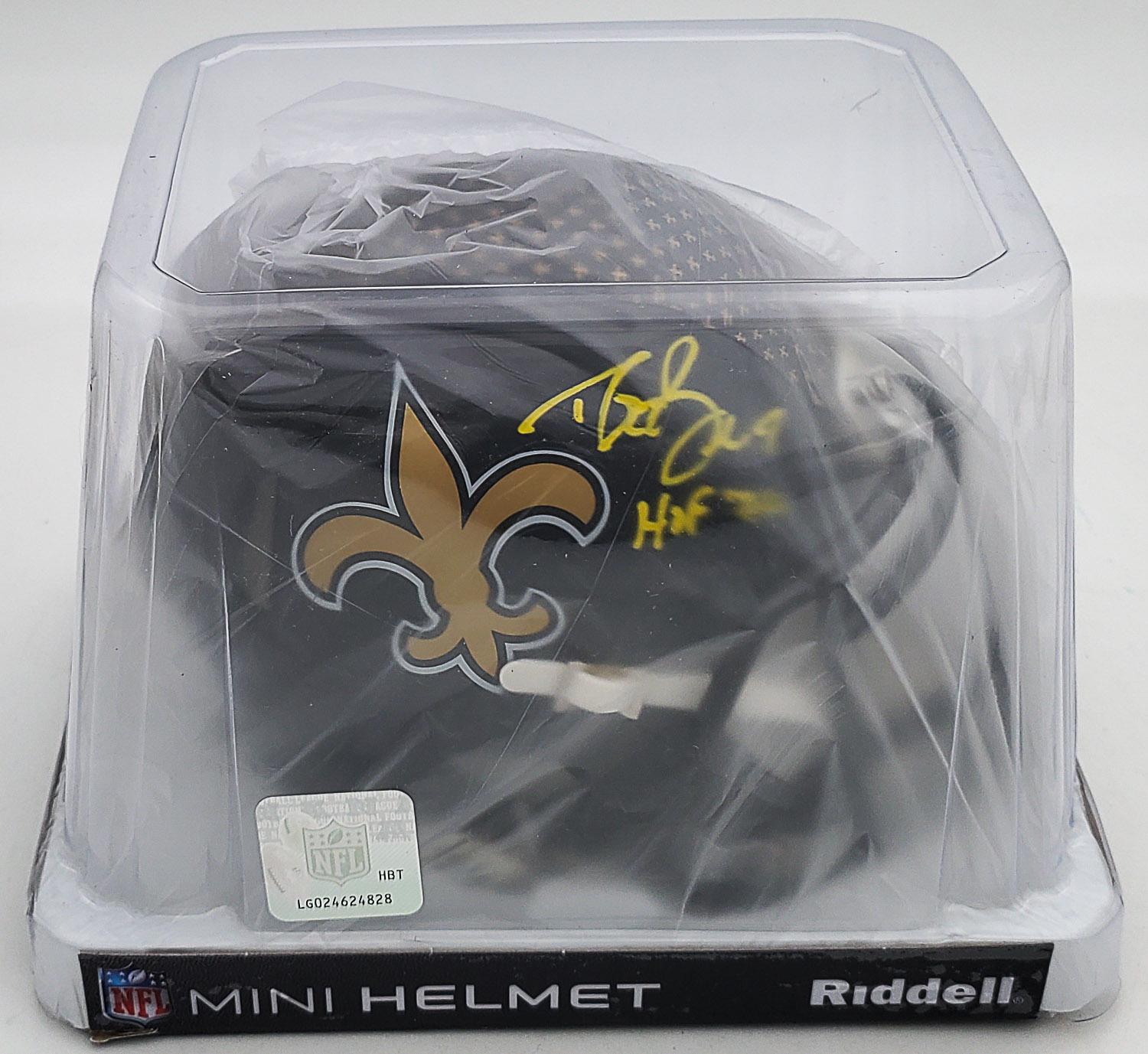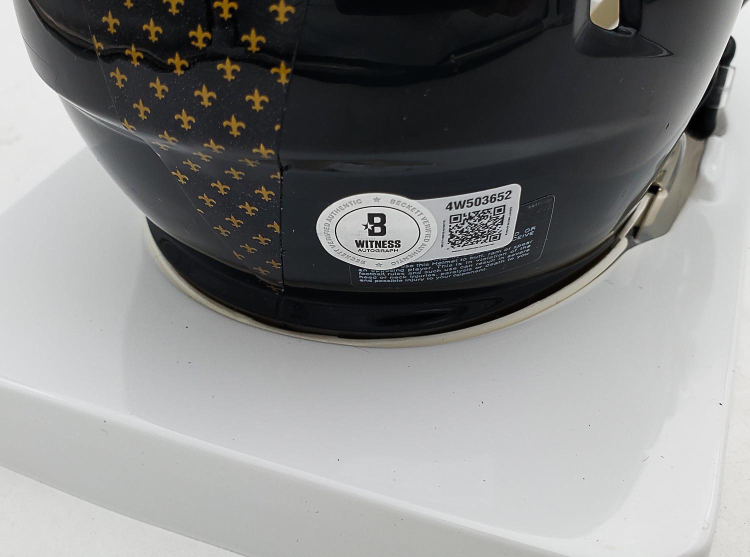 This autographed Riddell Speed mini helmet has been personally hand-signed by Drew Brees "HOF 26" of the New Orleans Saints. This autograph is certified by Beckett Authentication Services (BAS) Witness Certification. That means that a Beckett representative was present when this item was signed. It comes with the numbered authentication hologram with a QR code that verifies the authentication on the Beckett website.
