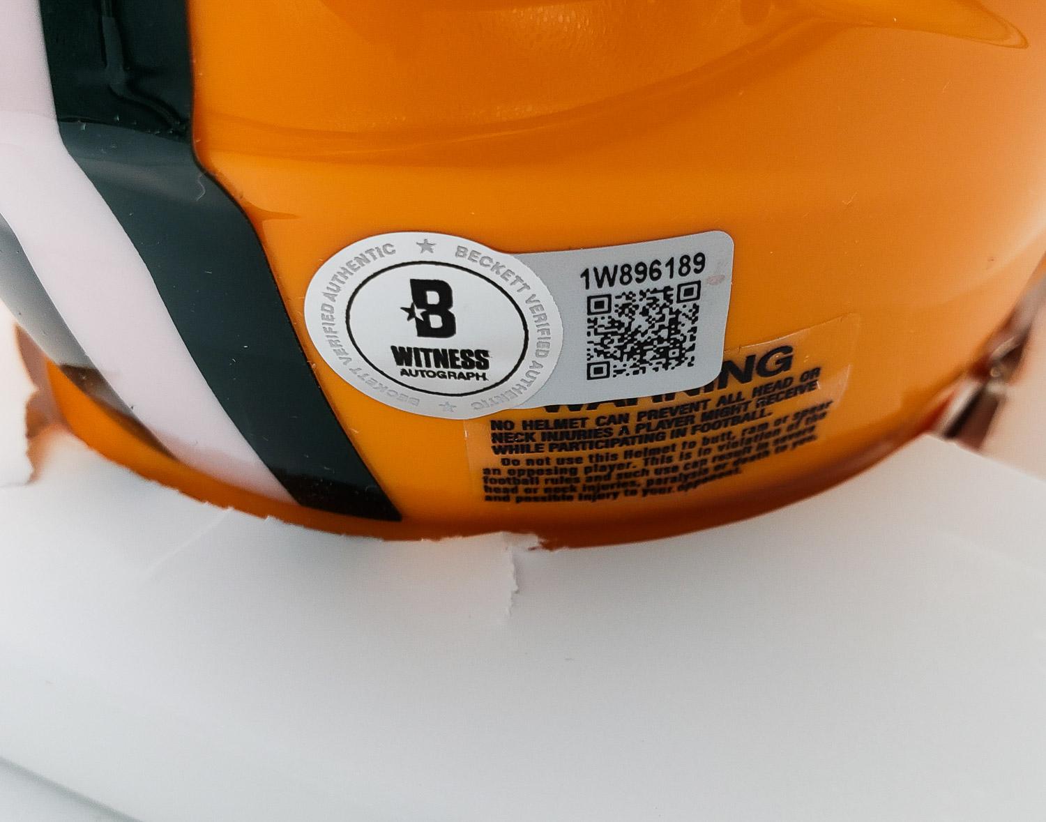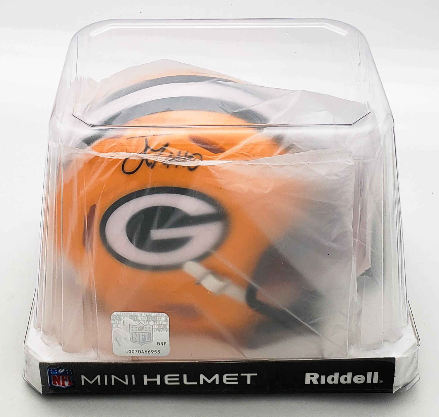 This autographed Riddell Rave Collection Speed mini helmet has been personally hand-signed by Jordan Love of the Green Bay Packers. This autograph is certified by Beckett Authentication Services (BAS) Witness Certification. That means that a Beckett representative was present when this item was signed. It comes with the numbered authentication hologram with a QR code that verifies the authentication on the Beckett website. Stock images are used for this listing. The item you will receive will be of equal quality to the one pictured. The signature location may vary slightly.