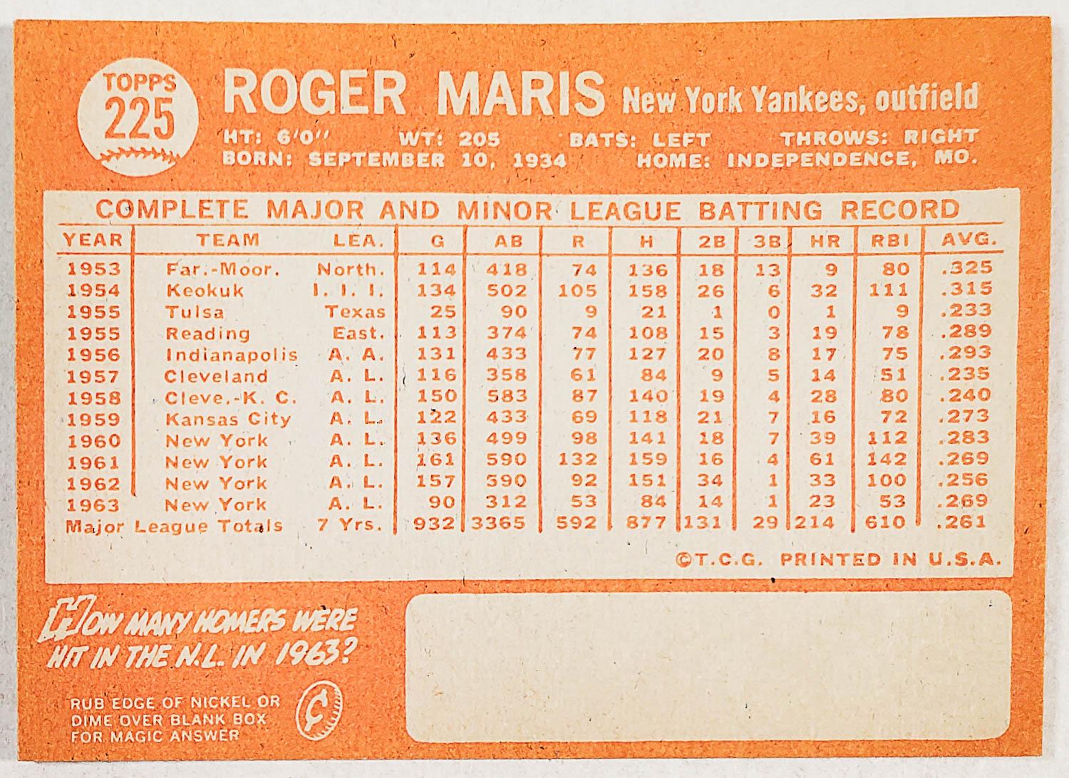 Roger Maris 1964 Topps Card #225. Please see pictures for details on the condition of these cards.